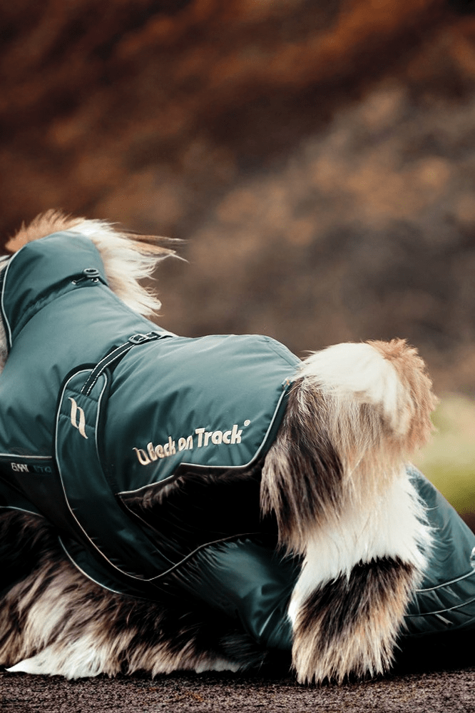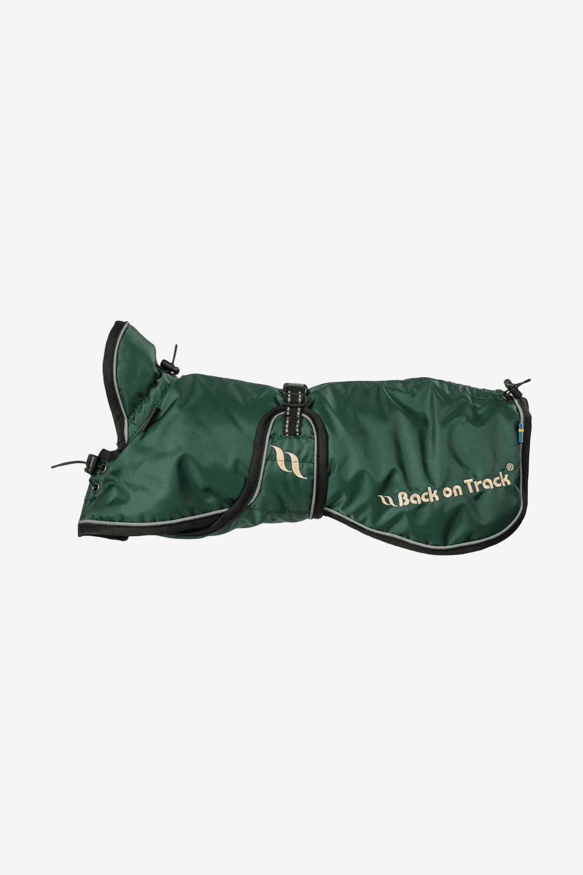 Vand- og vindafvisende overflade med tapede sømme. Lukkes med et justerbart spænde på ryggen. Aftagelige elastiske benstropper kan fastgøres, hvis man ønsker, at dækkenet skal sidde tættere mod bagbenene.