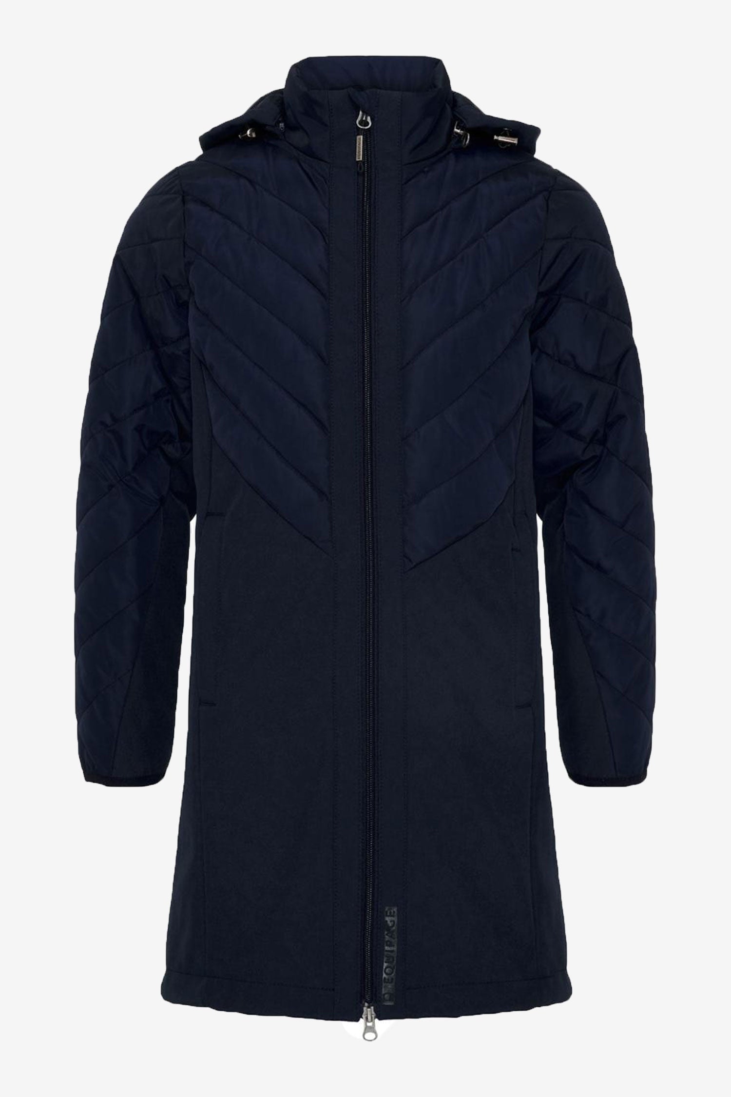 Equipage junior Gaia Jakke Navy. Jakke i hybridmodel med quiltet overdel og ærmer samt underdel af softshell. Ydermaterialet er vandafvisende og tåler let støvregn. Hybridmaterialet gør frakken let og smidig, og den kan nemt bruges under en tykkere frakke, når kulden sætter ind. To-vejs lynlås foran og en aftagelig hætte, der også kan justeres med elastiske remme.