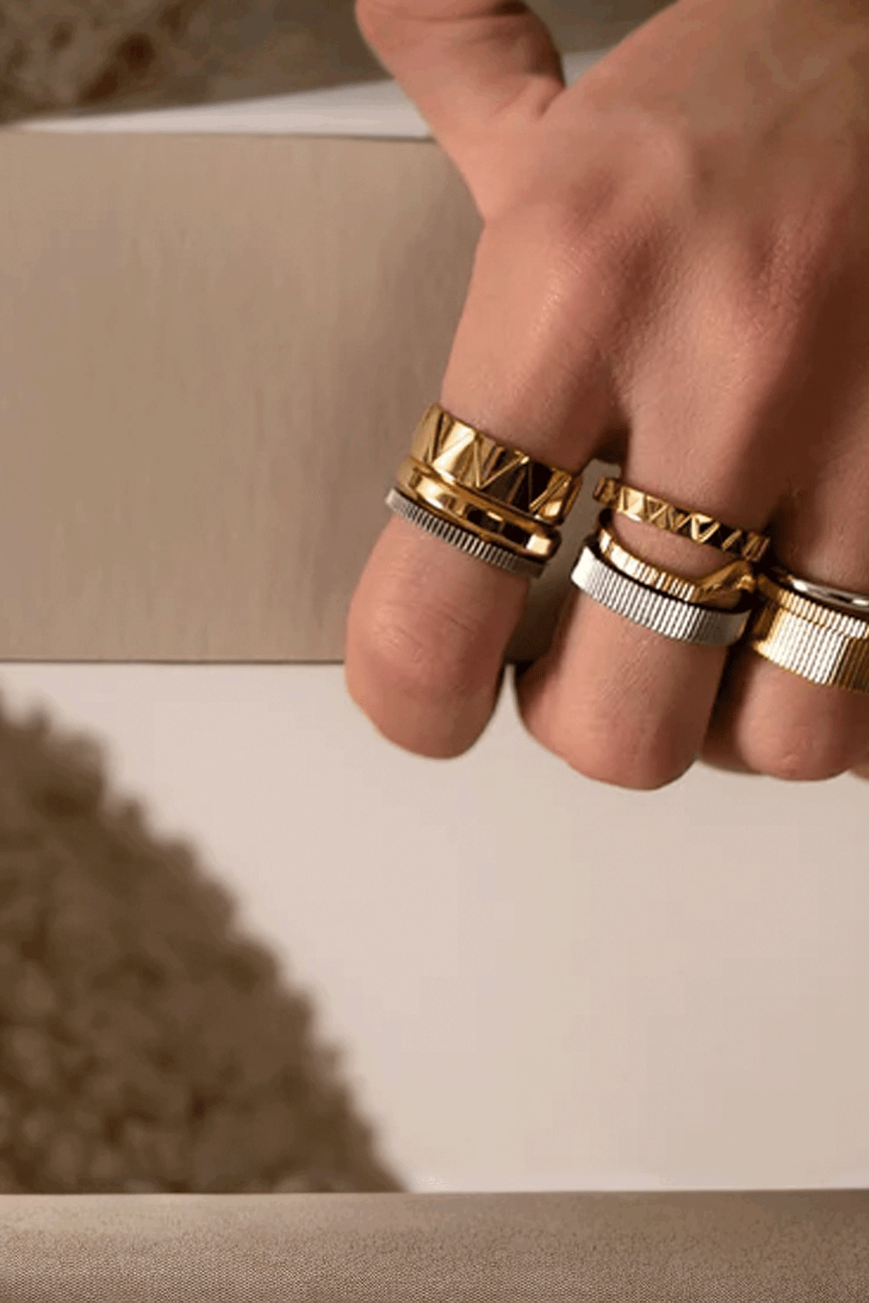 De nye Sharktooth ringe fås i to forskellige bredder, og i guld og poleret stål.