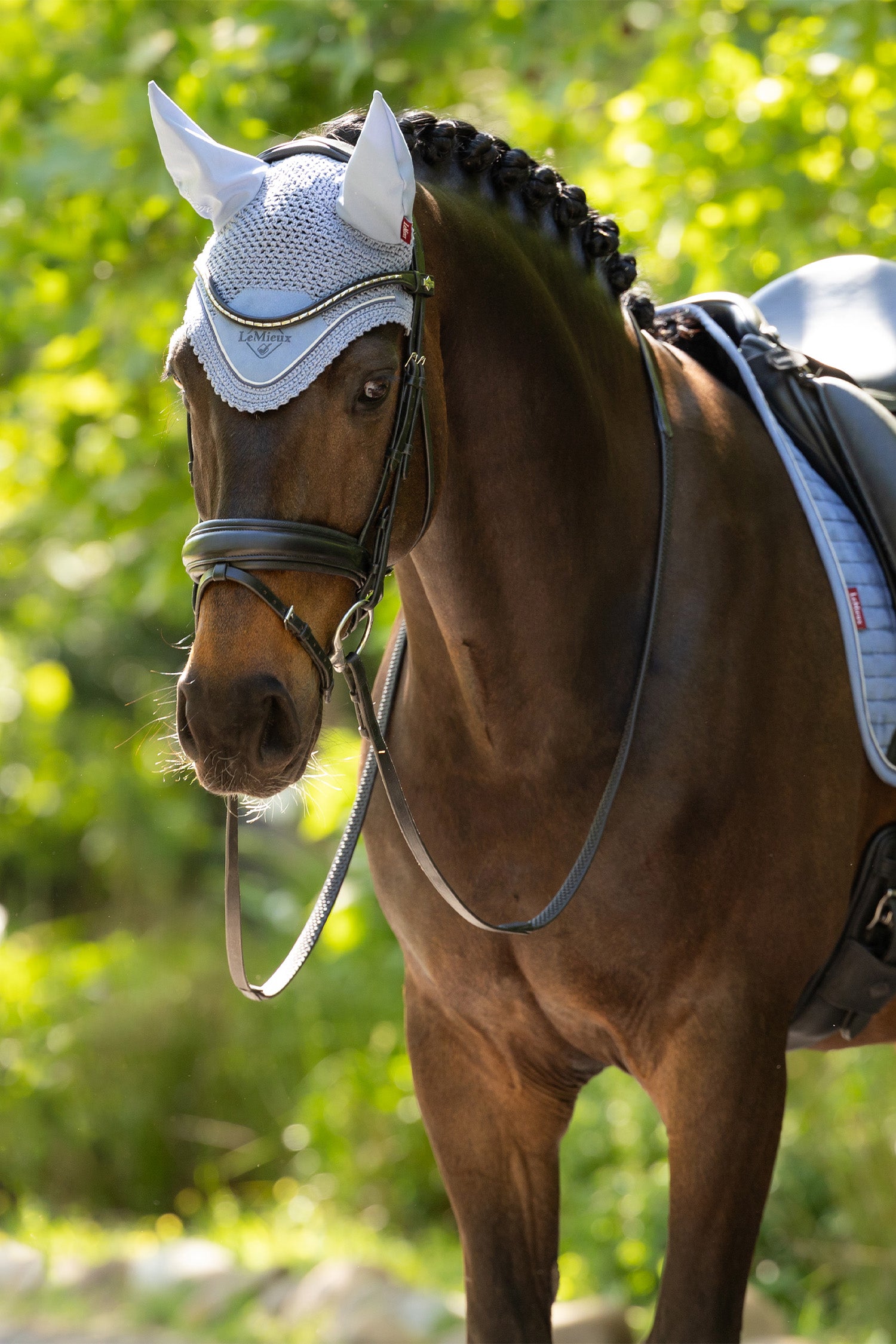 De bløde ører i elastisk materiale beskytter hesten mod insekter og dæmper forstyrrende lyde, hvilket hjælper hesten med at holde fokus. Den dekorative, snoede kant og det diskrete logo giver en elegant finish, der matcher perfekt med øvrige produkter i LeMieuxs farvekollektion.