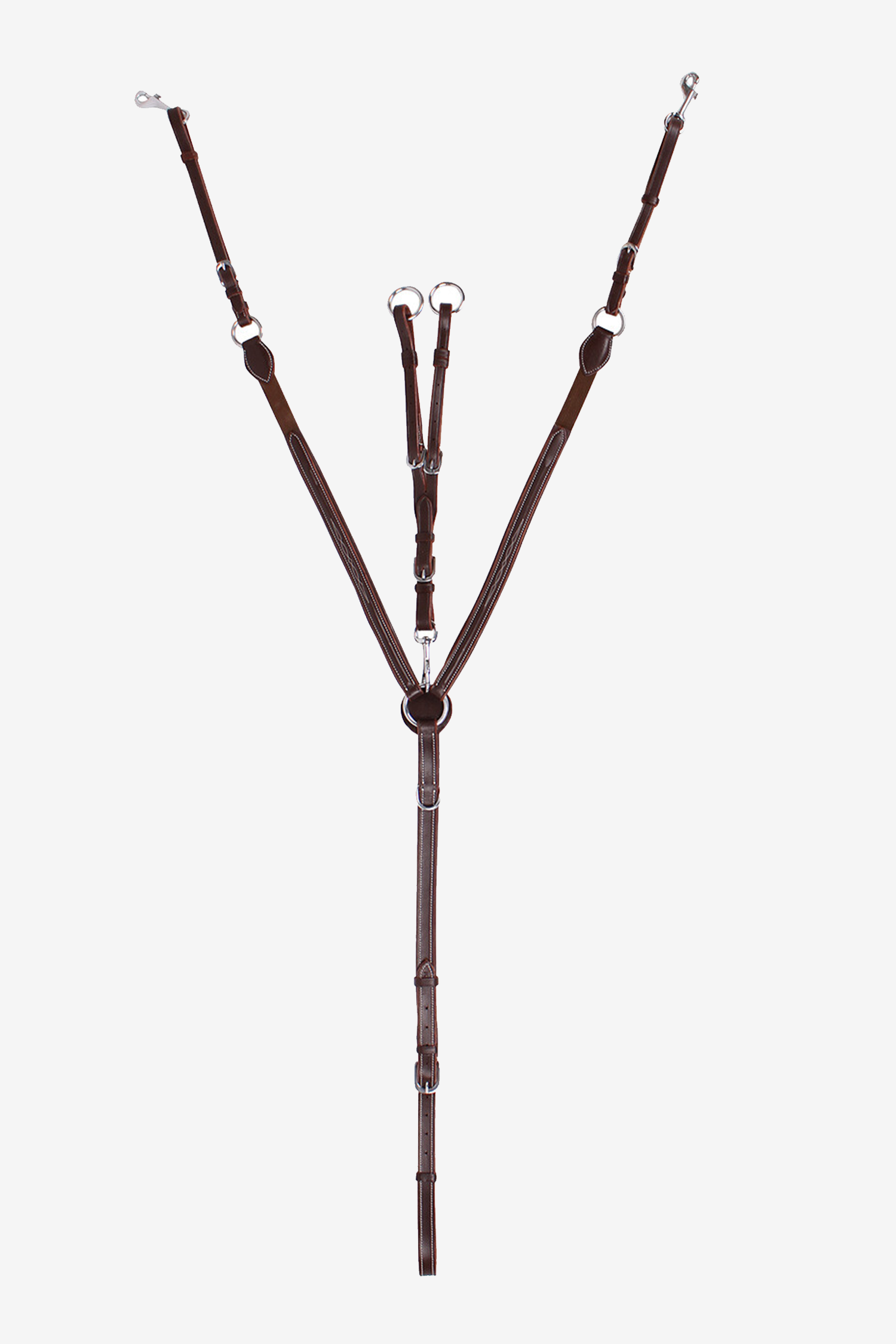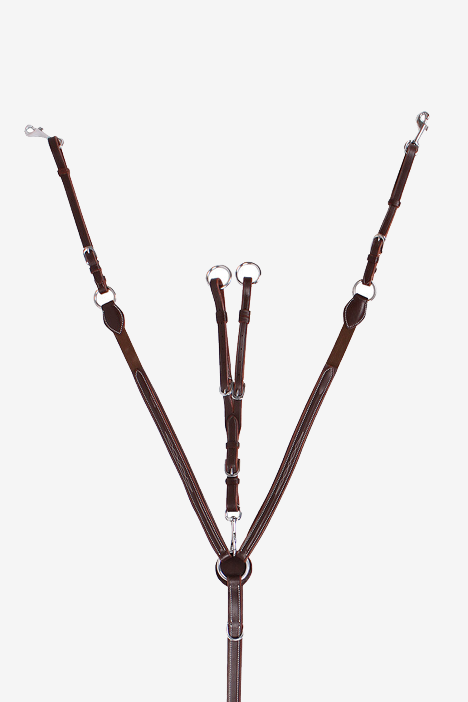 Fortøjet har en aftagelig løbende martingal med praktiske snaplukninger, hvilket gør det nemt at tilpasse udstyret efter hestens behov og dagens ridetur. De elastiske indsatser ved sadelfæstet giver øget bevægelsesfrihed og en fleksibel pasform, samtidig med at alt holdes sikkert på plads.
