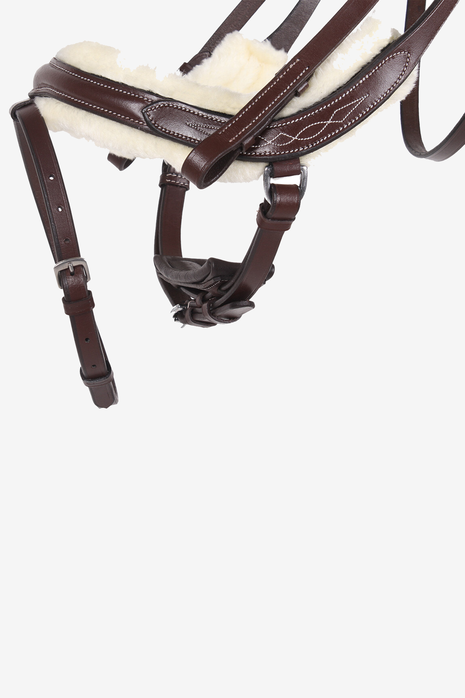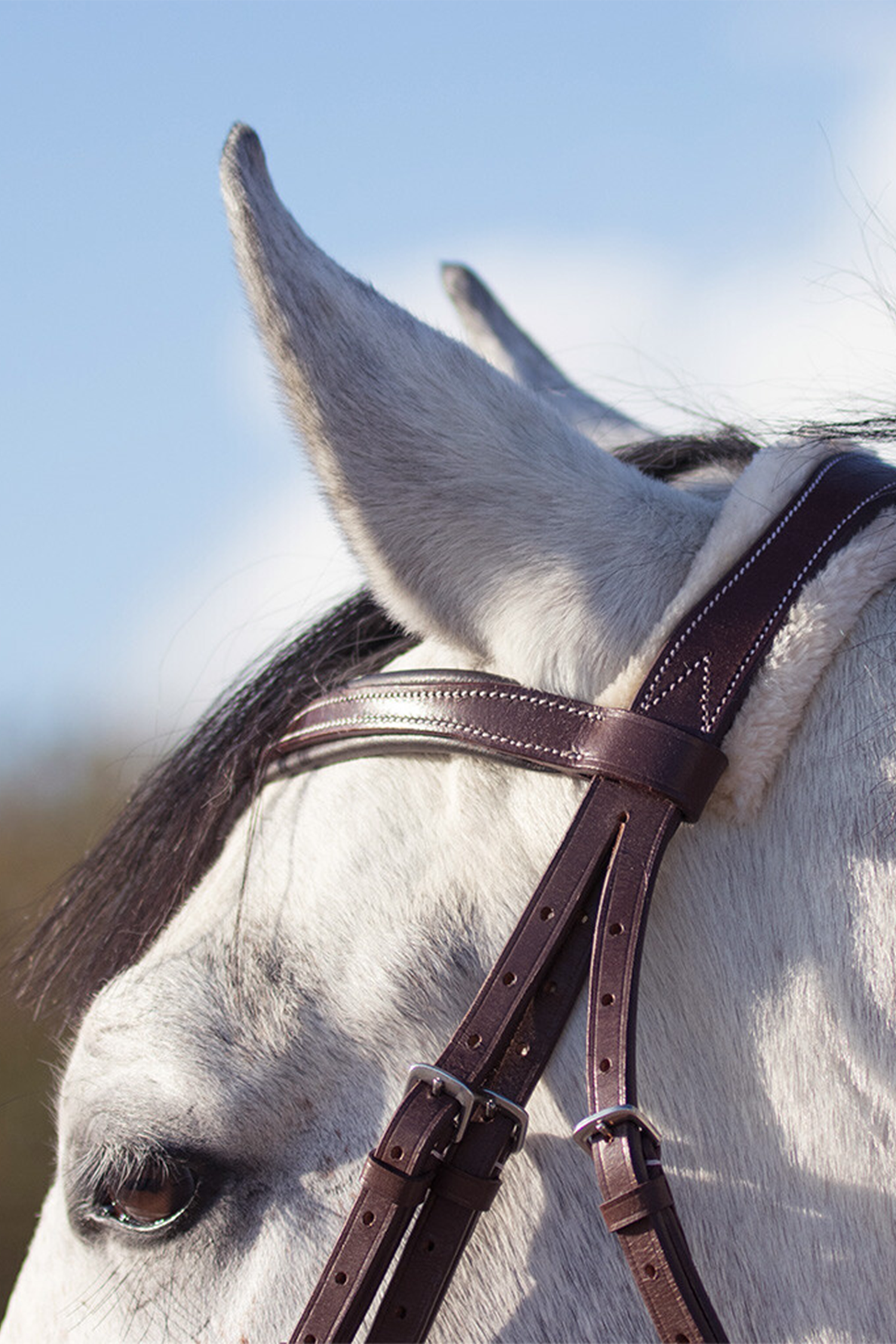 Trensen er fremstillet i blødt kvalitetslæder med hvid dekorativ syning, der giver et eksklusivt, luksuriøst udtryk. Det anatomisk formede nakkestykke er let tilbagetrukket for at aflaste trykket bag ørerne, og næsebåndet har en særligt udformet pasform, der fordeler trykket jævnt over næseryggen.