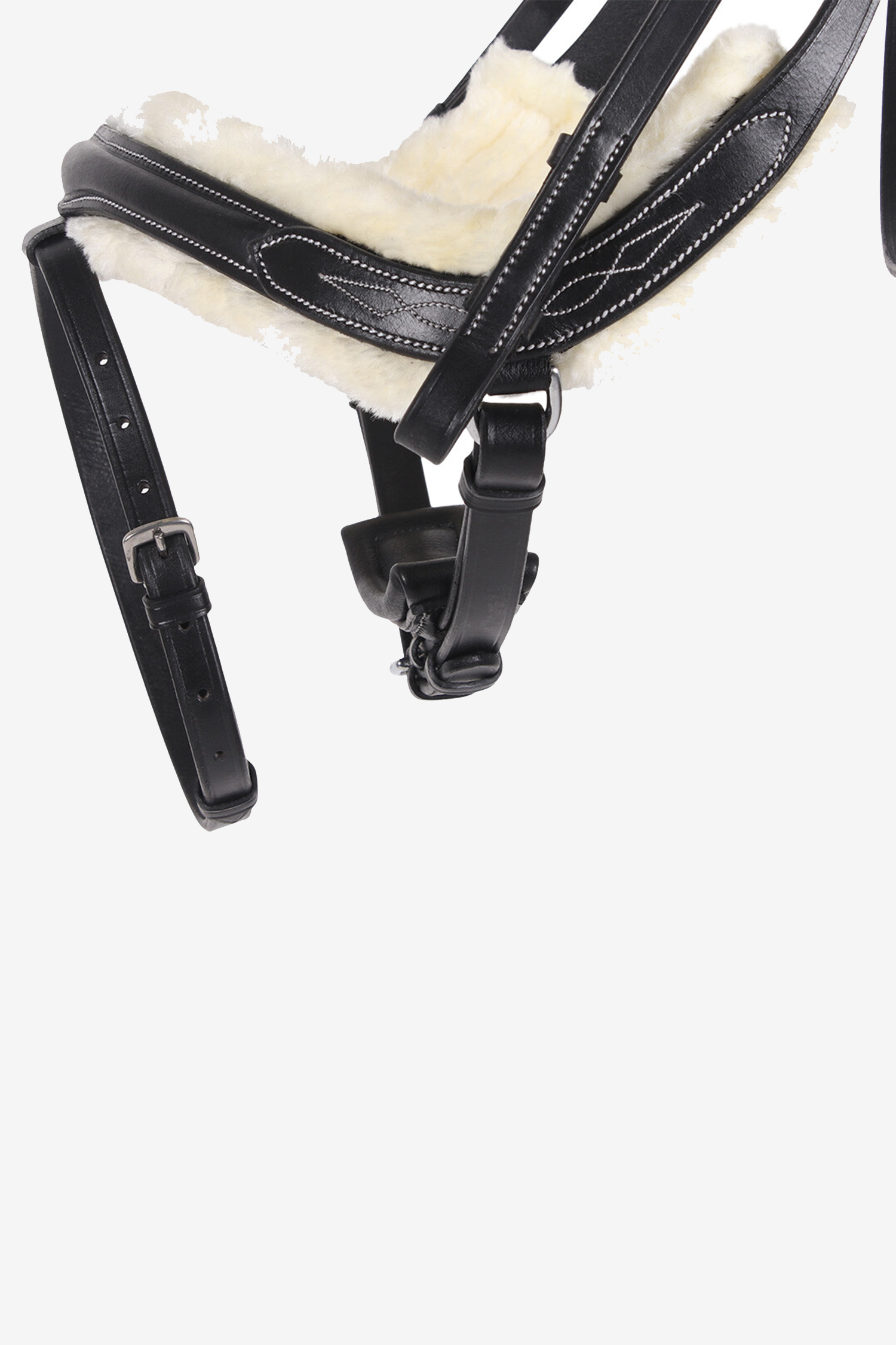 Trensen er fremstillet i blødt kvalitetslæder med hvid dekorativ syning, der giver et eksklusivt, luksuriøst udtryk. Det anatomisk formede nakkestykke er let tilbagetrukket for at aflaste trykket bag ørerne, og næsebåndet har en særligt udformet pasform, der fordeler trykket jævnt over næseryggen.