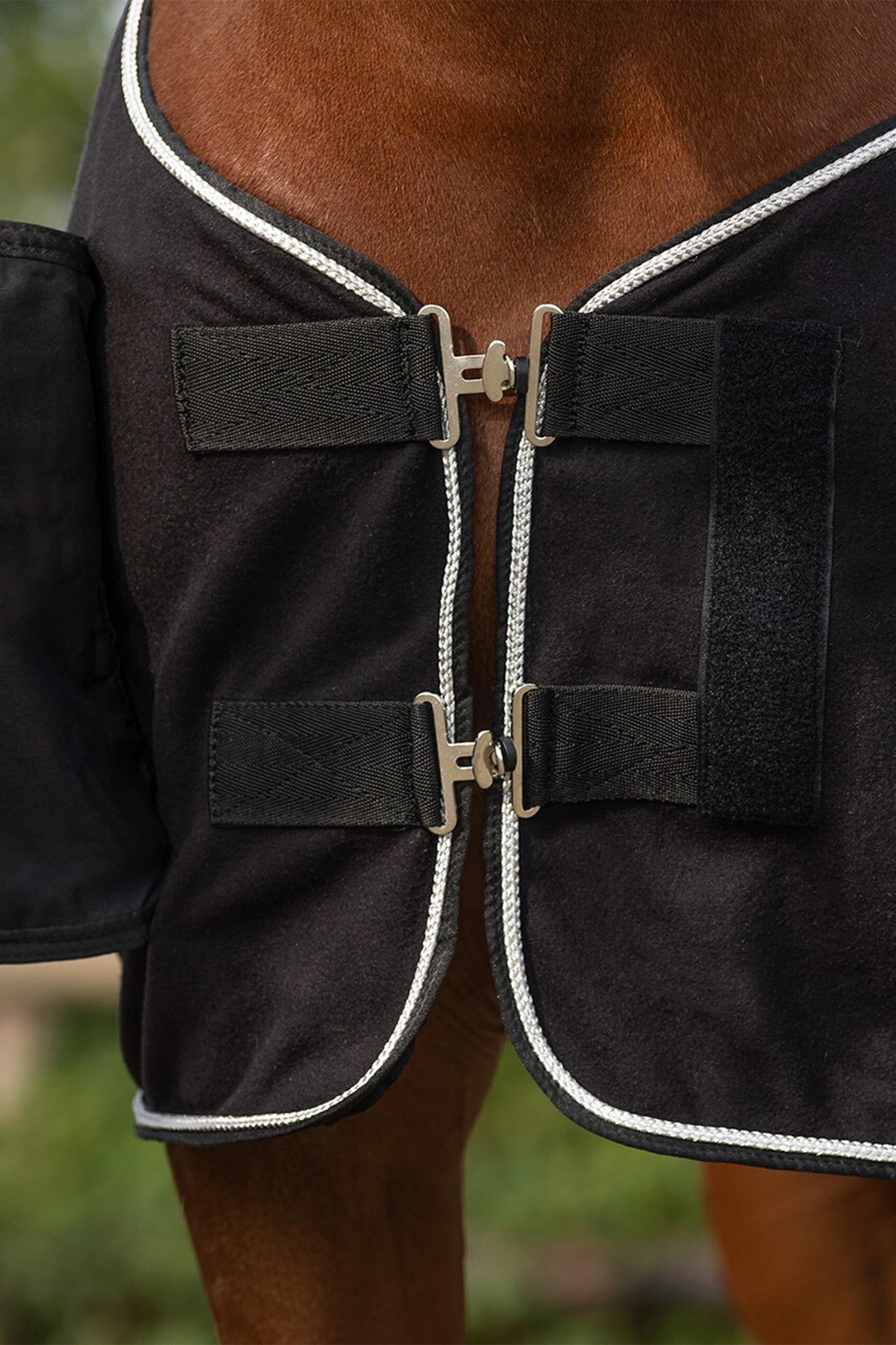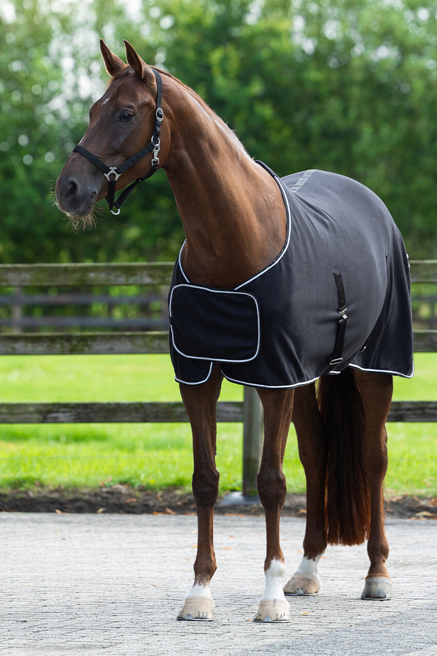 Fremstillet i blødt og slidstærkt 240 g fleece, der effektivt transporterer fugt væk og føles behageligt mod hestens hud. De aftagelige krydsgjorde gør dækkenet alsidigt og nemt at tilpasse efter behov, mens de dobbelte frontlukninger dækkes af en flot brystflap med velcrolukning for en ekstra eksklusiv finish.