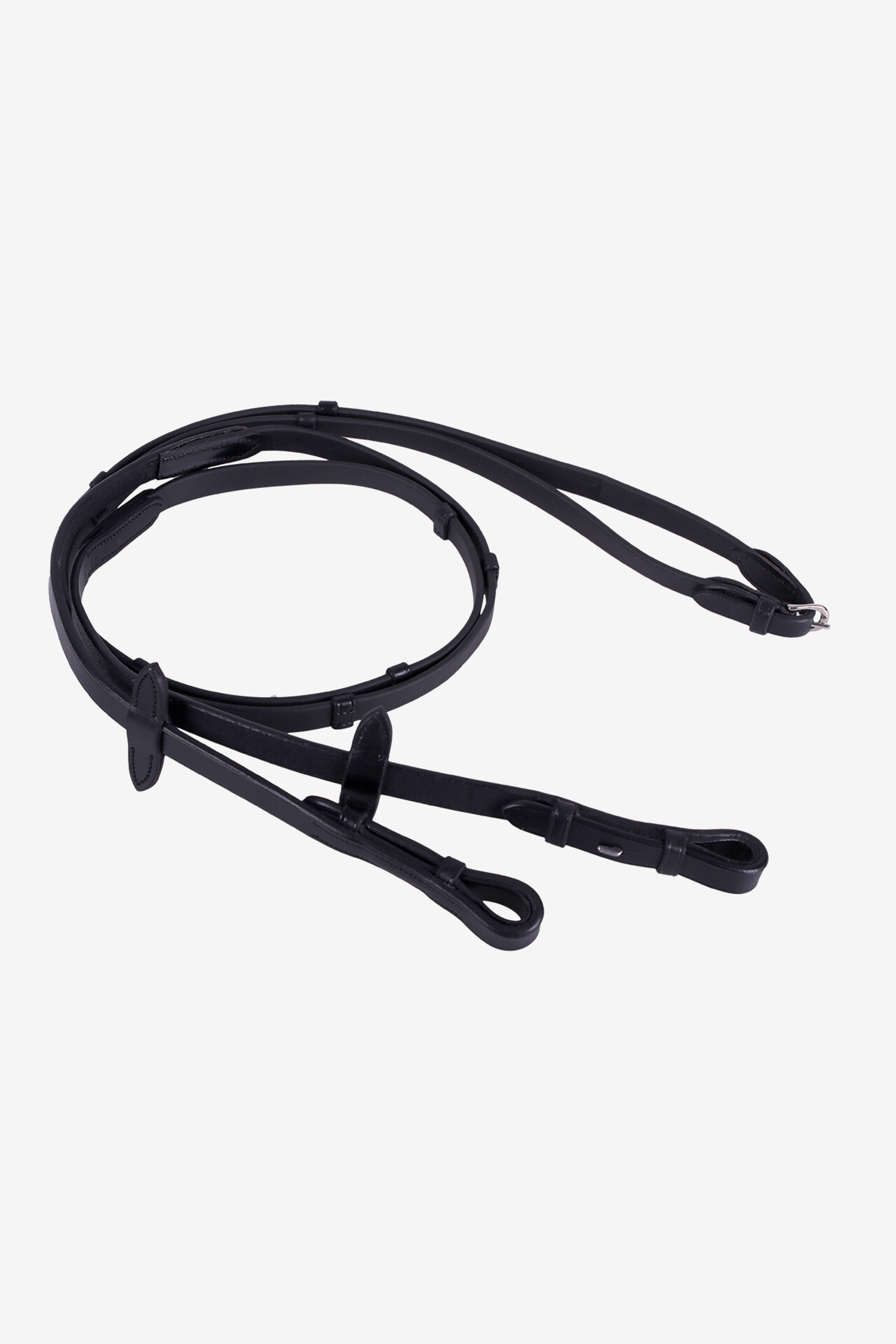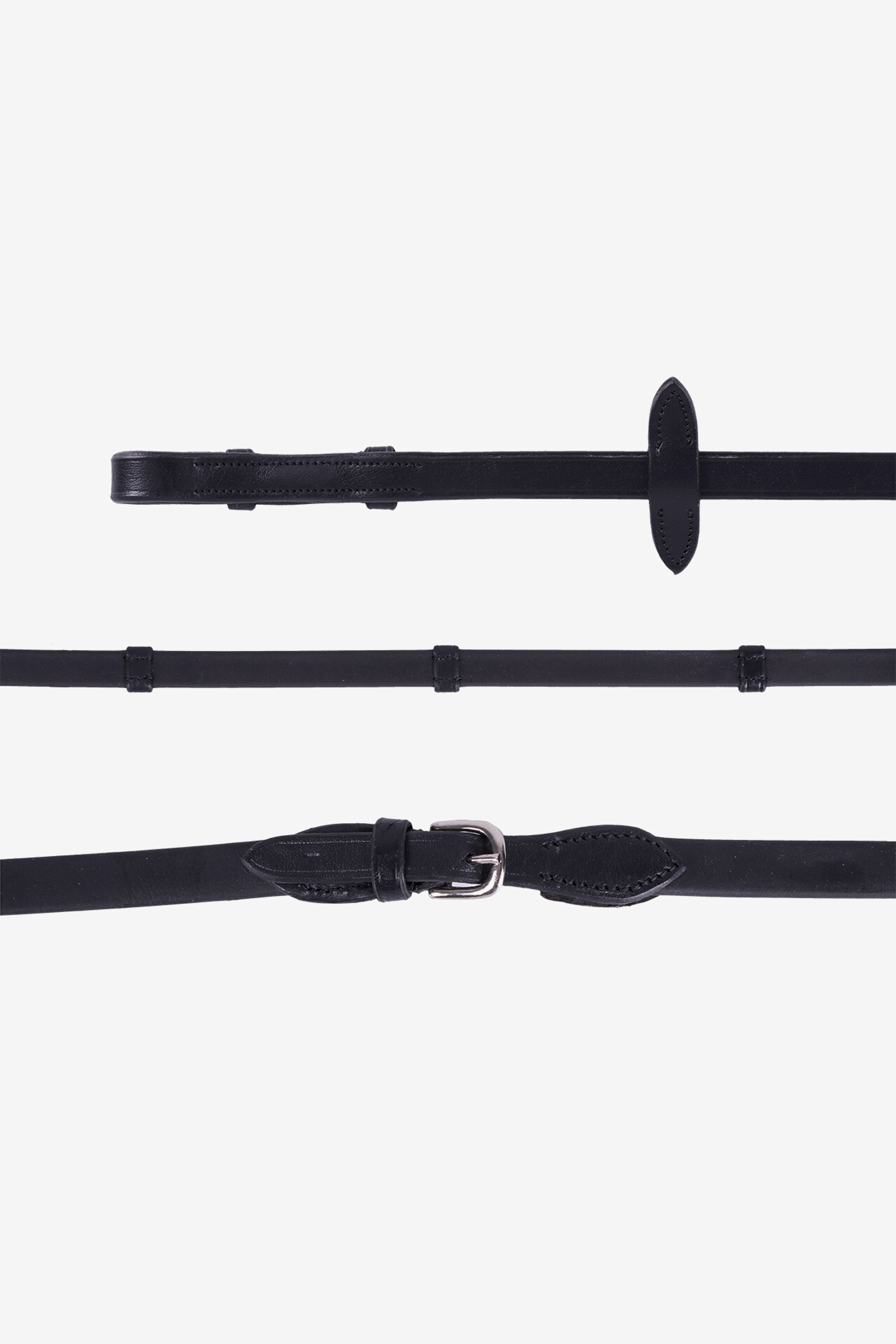 Tøjlerne er fleksible og behagelige i hånden, udstyret med læderstop for godt greb og martingalstop i samme elegante stil. De fastgøres nemt med rustfri stål hakspænder og har en bredde på 15 mm – perfekt balance mellem greb og fornemmelse.
