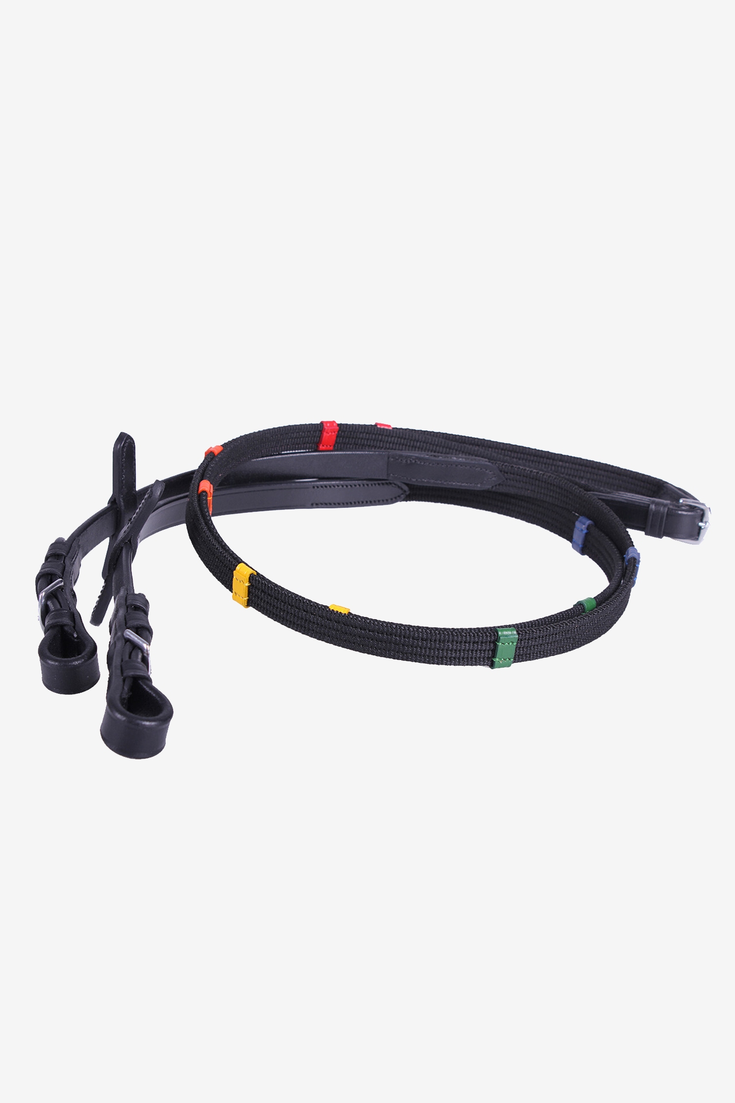 Disse webtøjler med farvede stop er det perfekte hjælpemiddel for børn og begyndere, der skal lære at finde den rigtige håndposition i sadlen. De fem forskellige farvemarkeringer gør det nemt at forklare og vise, hvor rytteren skal holde tøjlerne, hvilket giver en tydelig og sjov indlæring.