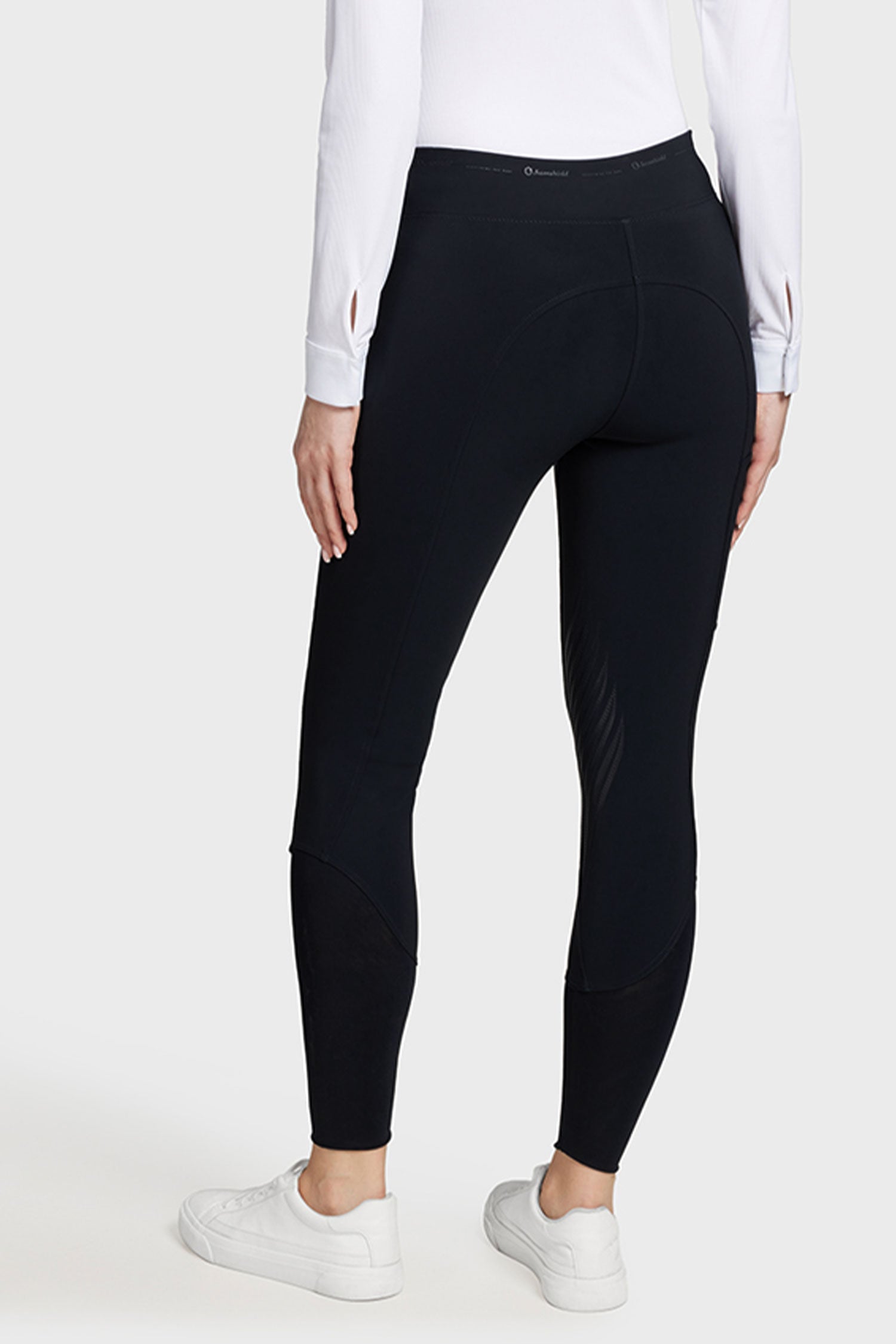 Alpha-modellen fra Samshield er meget behagelig at have på takket være det elastiske linning uden knapper eller lukning og dets strækbare materiale, som også er krølfrit og hurtigtørrende. De tilpasser sig perfekt til kroppen og giver en flot silhuet. Denne model har knægrip og giver et godt greb i sadlen. De er også behandlet for at modstå solens UV-stråler på sommerens solrige dage. Forlommerne lukkes med lynlås. Der er en mobillomme på venstre lår. Flotte detaljer med Samshield-tekst rundt om linningen og deres logo i Swarovski-krystaller langs venstre lår.