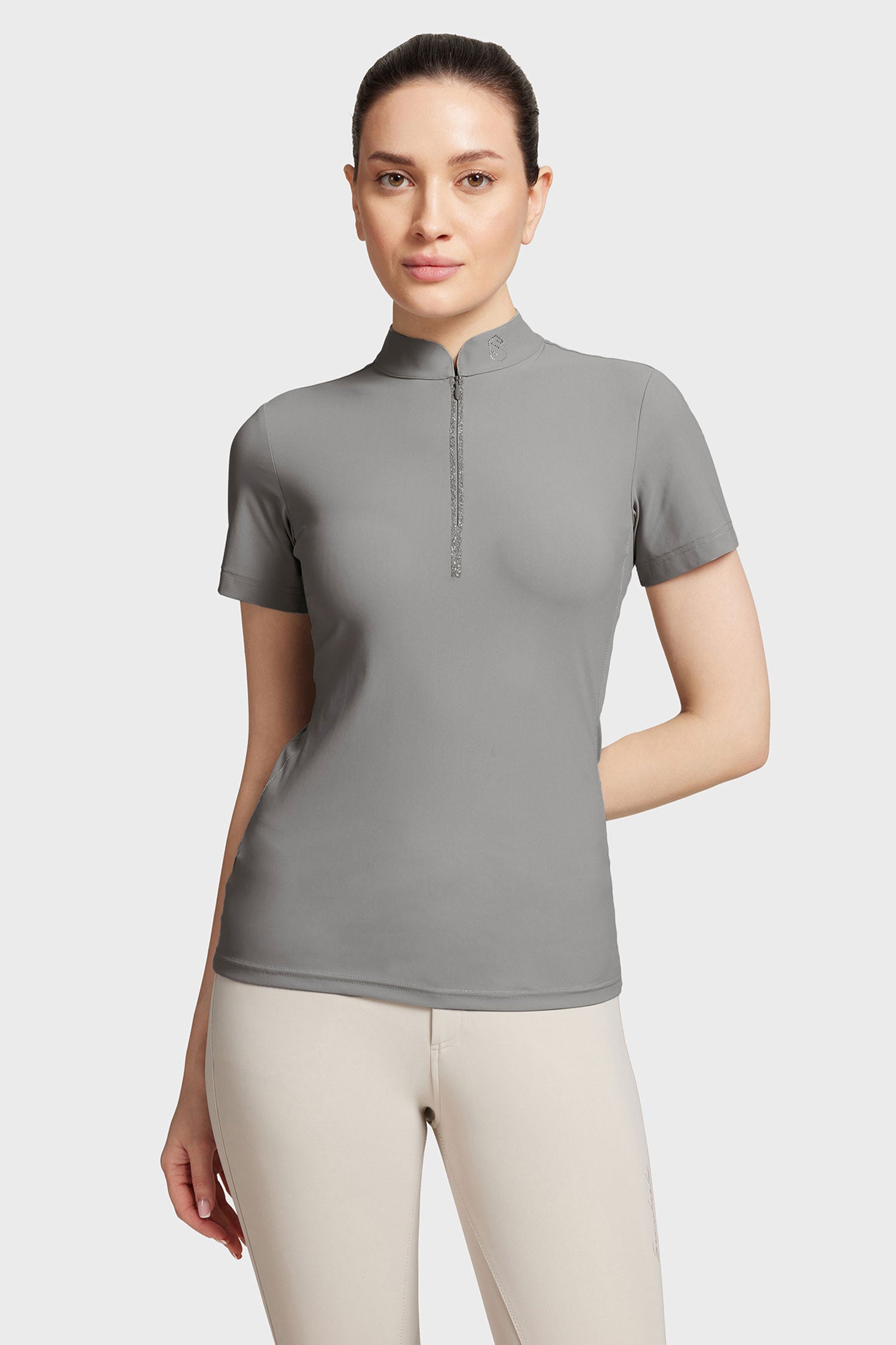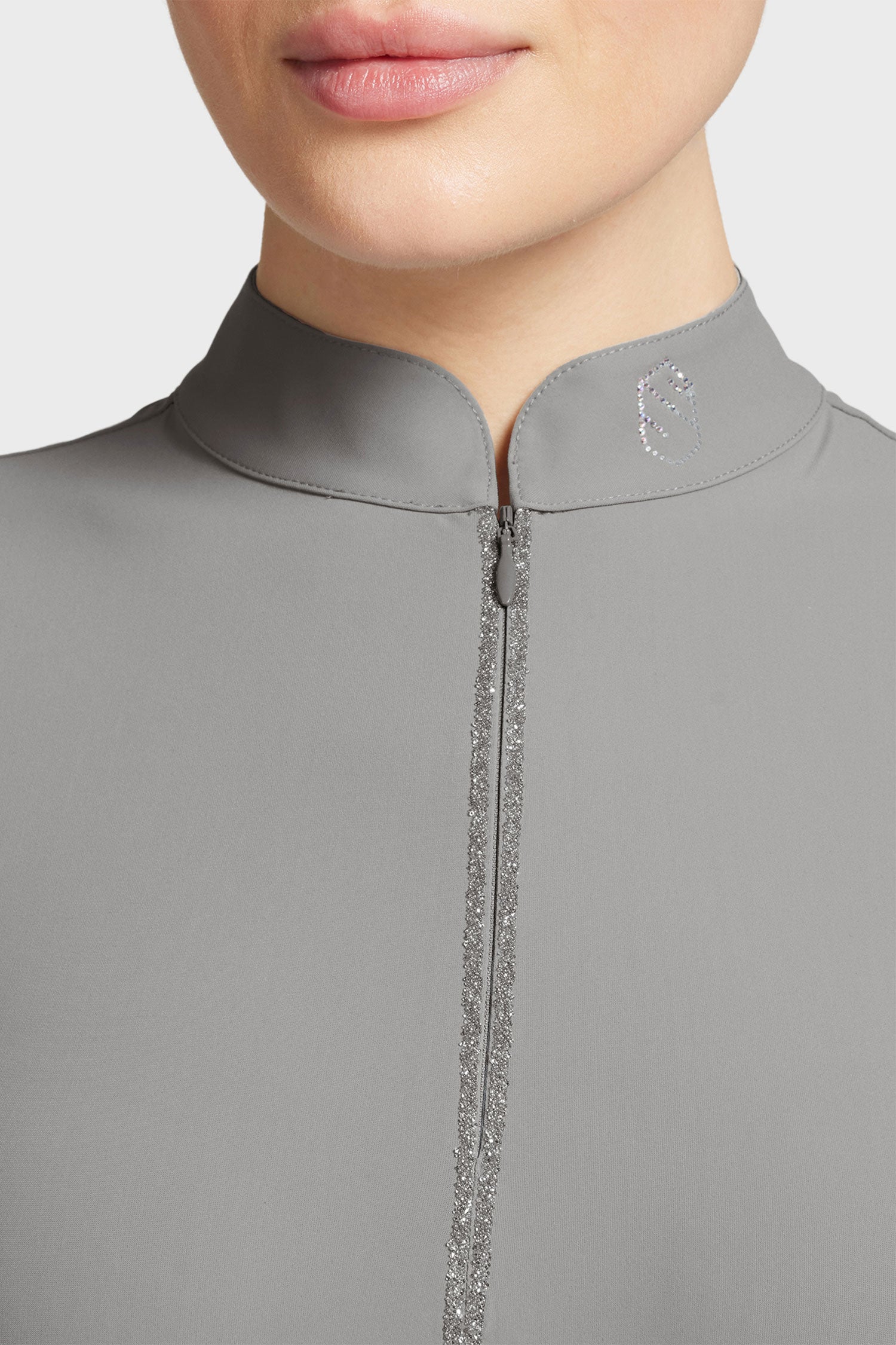 Det lette og smidige stof transporterer hurtigt fugt væk fra kroppen og tørrer på kort tid. Kort lynlås foran med Crystal Fabric og smukke sten langs lynlåsen. Logo på kraven med metalnitter.