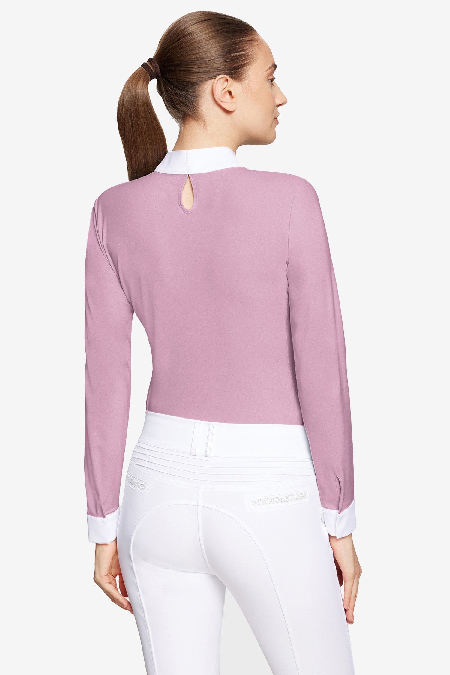 En stilfuld konkurrenceskjorte fra Samshield, hvor den bløde rosa nuance Feather Pink skaber et elegant look, mens de hvide kontrastdetaljer på krave og manchetter giver et rent og sofistikeret udtryk, der passer perfekt under en ridejakke til stævner.