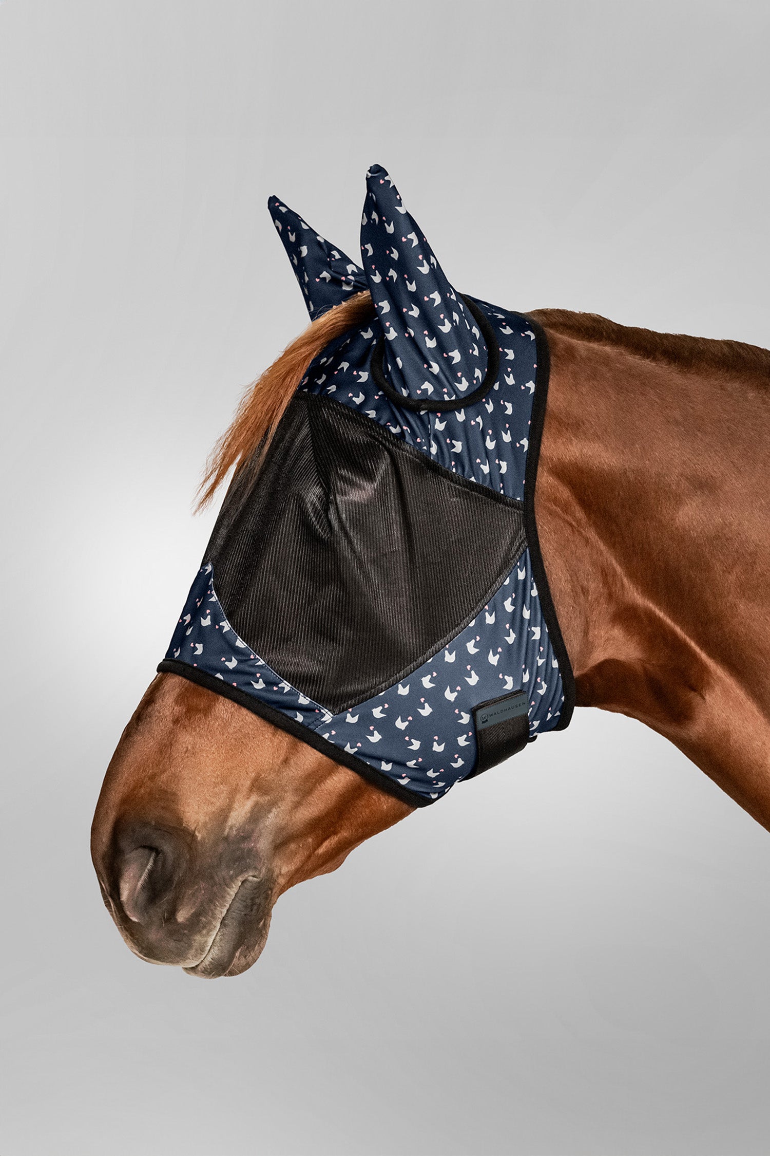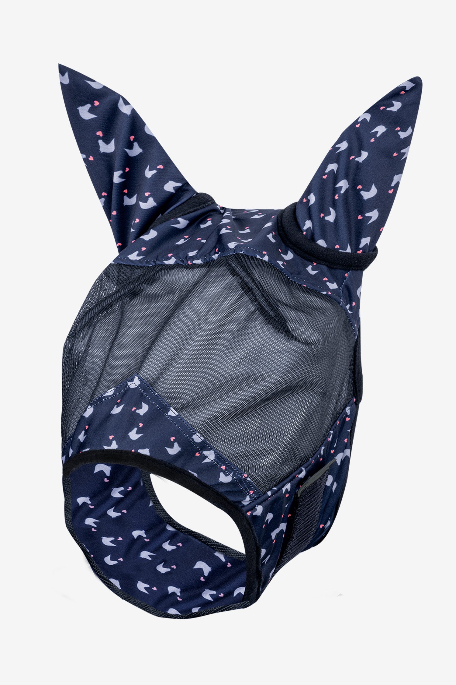 Som pricken över i:et är masken dekorerad med ett sött allover-tryck som gör att din häst inte bara är skyddad – utan också extra fin!