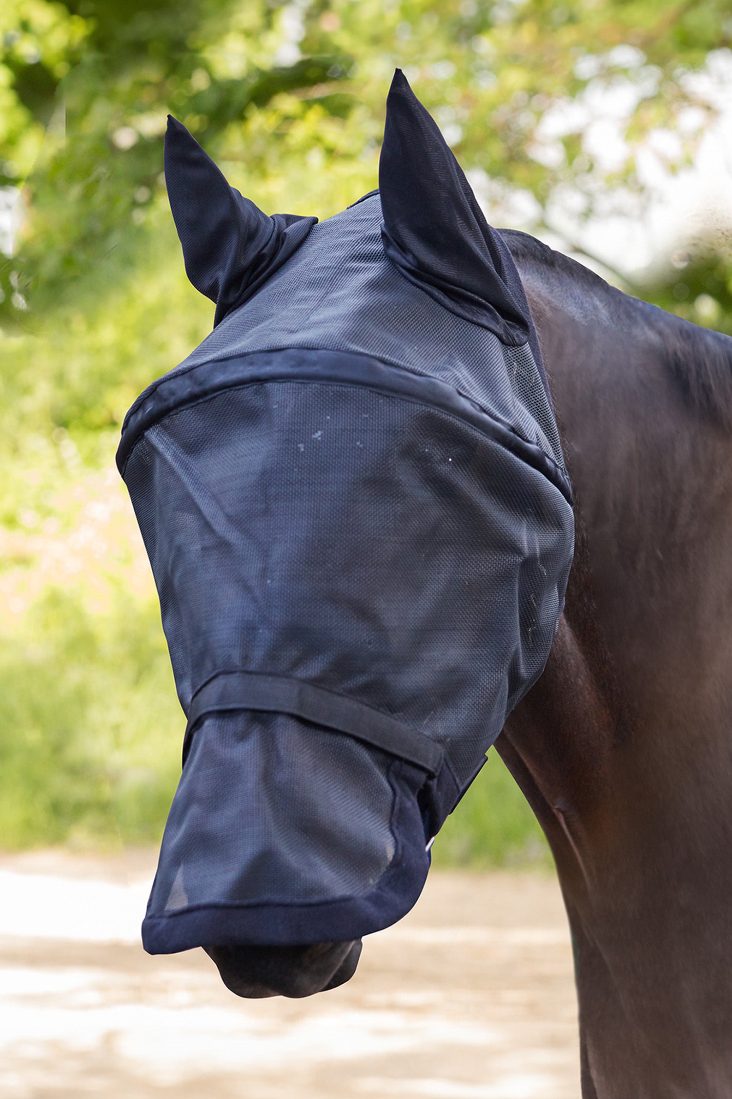 Det avtagbara nässkyddet kan enkelt tas bort med hjälp av ett kardborrefäste, vilket gör masken anpassningsbar efter hästens behov eller väderförhållanden.
