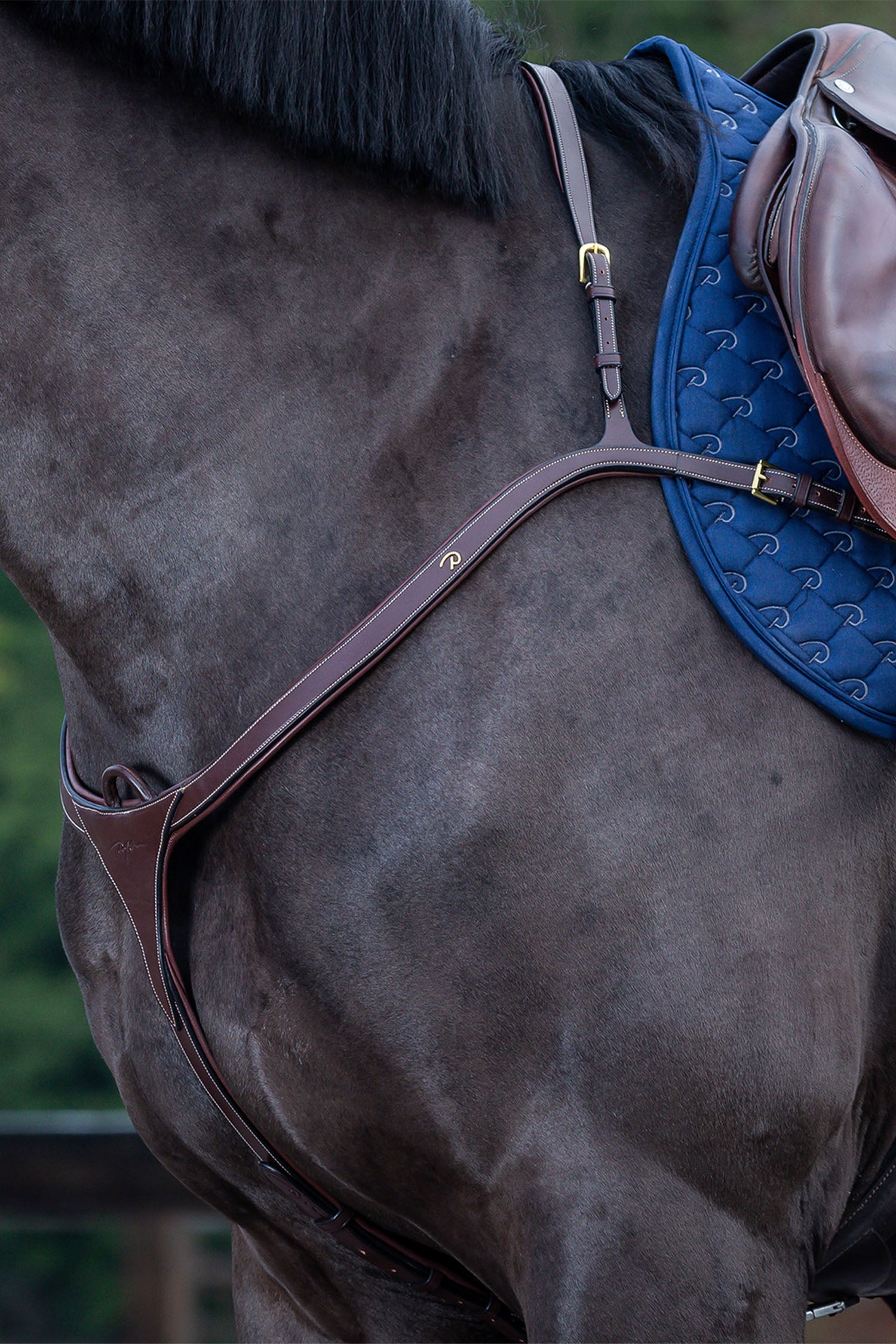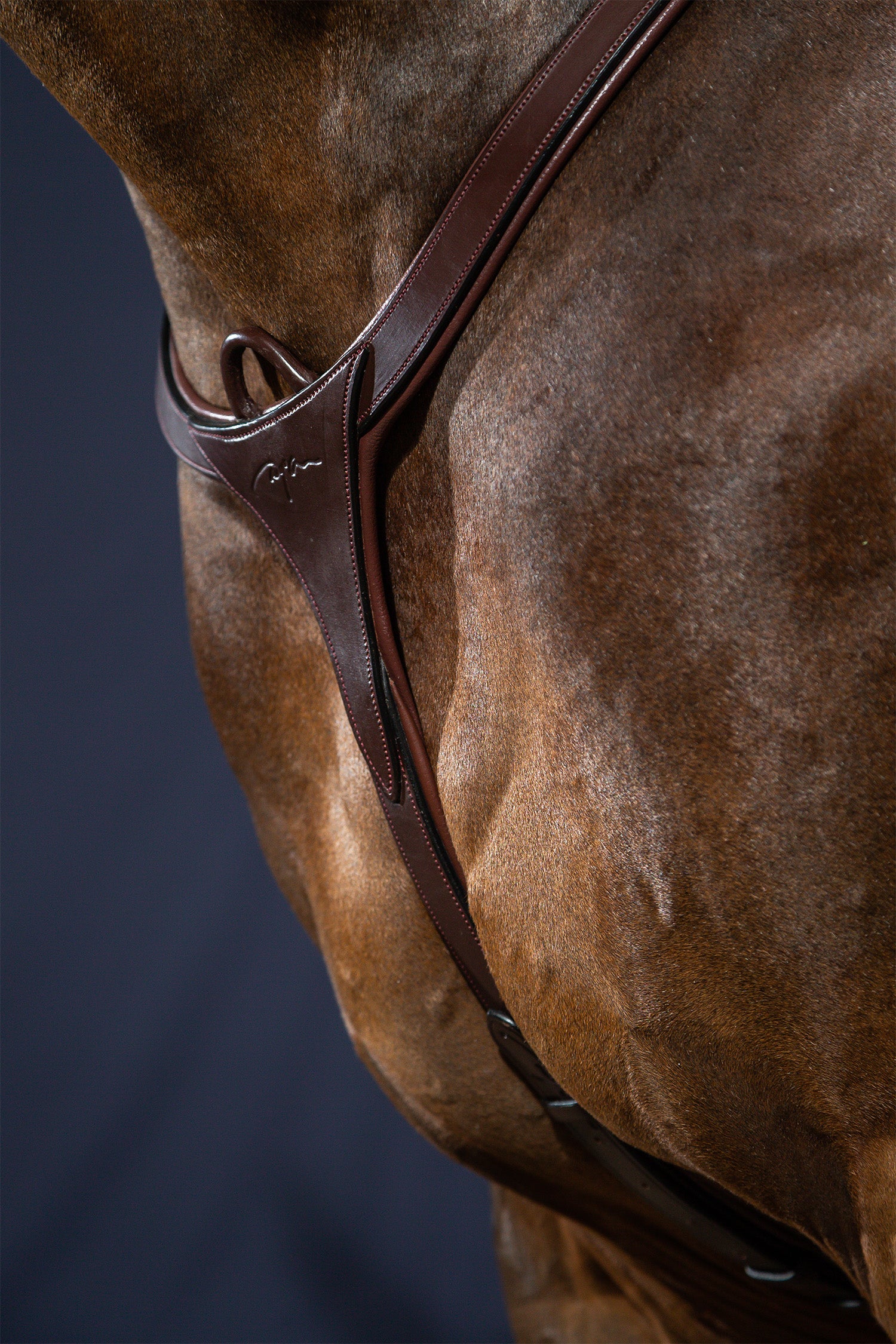 En fantastisk fin brösta från Dyón Collection. Bröstan har en lång justerbar brygga och den fästs i sadelns stroppar. Den är gjord av mjukt läder från Spanien med spännen i mässing och fina vita mönstersömmar.