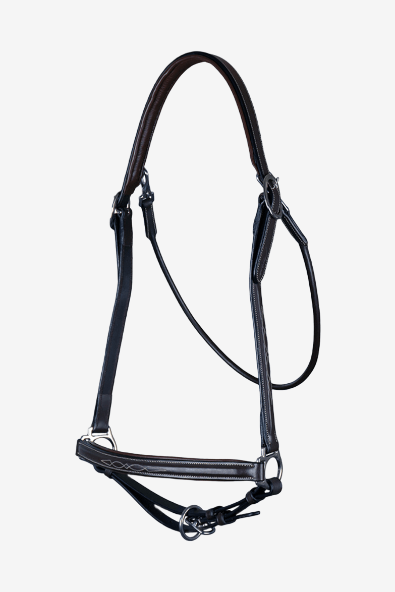 Grooming-grimma tillverkad i buffalo läder med silverspännen och vit mönstersöm. Speciellt designad för att lättare kunna borsta huvudet. Käkrem som lätt tas av och sätts fast med hjälp av smidiga hakar.