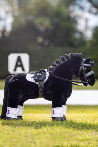Toy Pony Oskars päls är supersoft — perfekt att borsta och ta hand om — och har en tydlig ål längs ryggen. Hans tvåfärgade, upprättstående man liknar en fjordhästs och den tvåfärgade svansen går också att fläta.