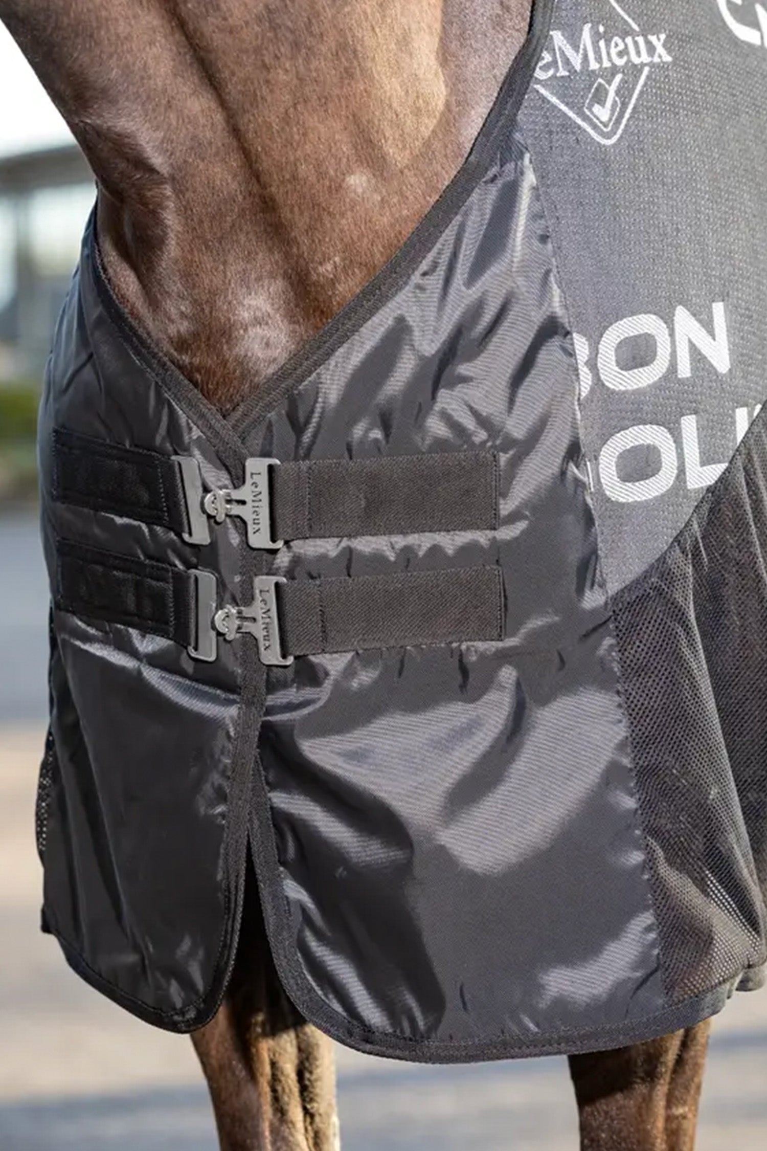 Detta högteknologiska coolertäcke är utvecklat för att reglera muskeltemperaturen på ett säkert och effektivt sätt efter träning, mellan klasser eller vid transport. Tack vare nanofiberbaserad kolfiberteknologi styrs luftflödet över hästens stora muskelgrupper – bog, rygg och bakdel – vilket säkerställer en skonsam nedkylning och bibehållen muskelhälsa.