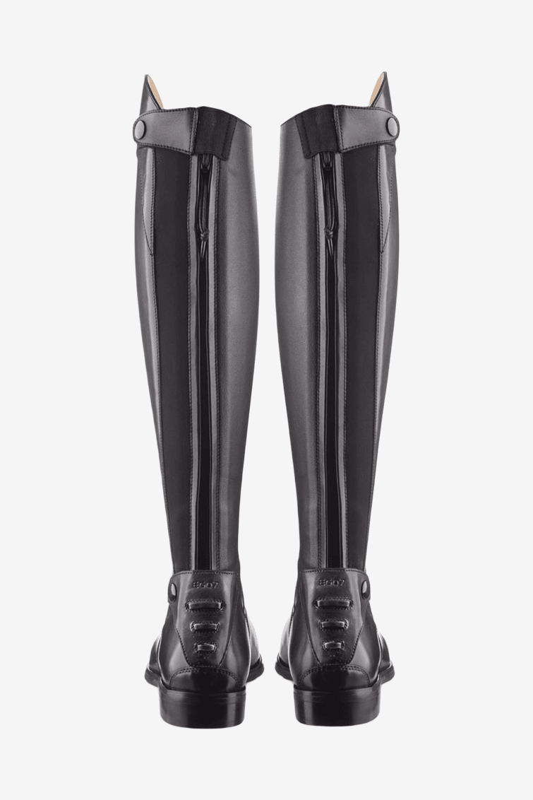 Stövlarna är tillverkade av full grain läder av hög kvalitet och extra mjukt läder över vristen för ökad komfort. Hel dragkedja av extra starkt material baktill med resår ger en stabil och hög komfort med rörelsefrihet och passform likt en måttanpassad stövel. På insidan av vaden har man bytt ut full grain lädret till det innovativa och väldigt slitstarka E-tex materialet. Dels skyddar det vaden bättre och ger även ett bra grepp och kontakt med hästen och sadeln. Baktill finns ett sporrstöd i plast med tre olika lägen för sporren som håller den stadigt på plats.