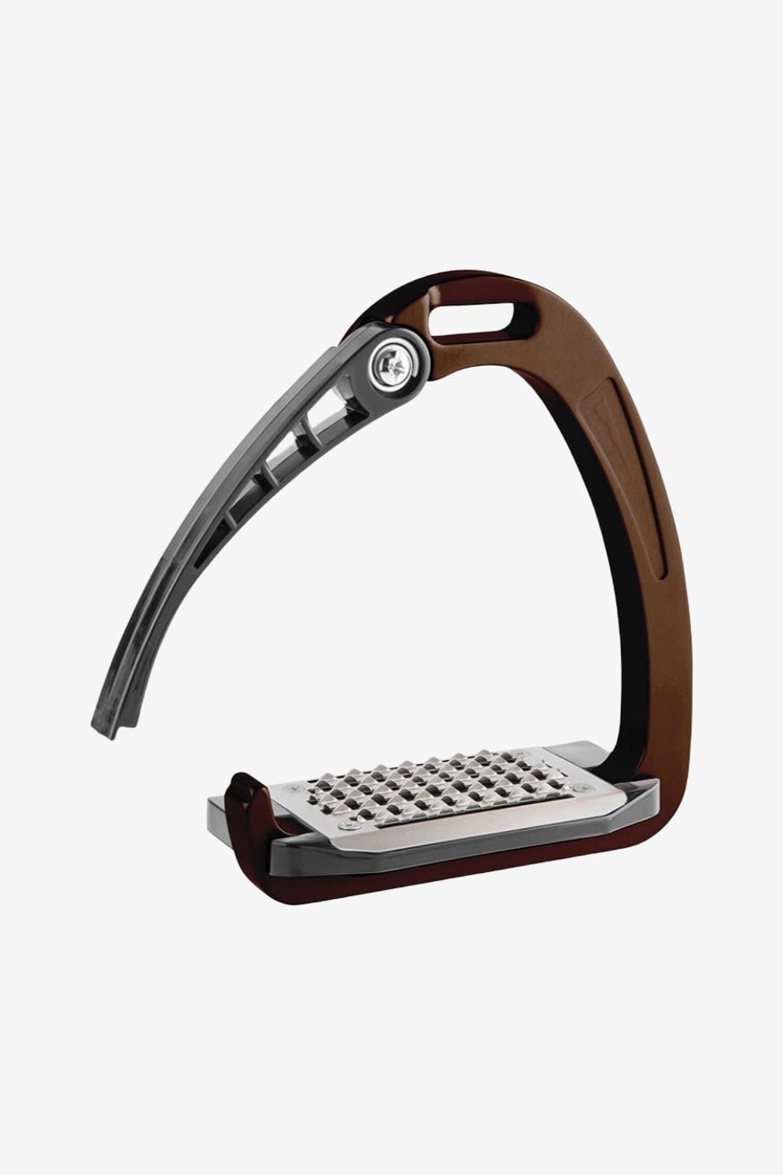 En säkerhetsstigbygel med en ytterbåge av aluminium och arm samt undre stigbygelplatta av speciellt polyamidmaterial.
