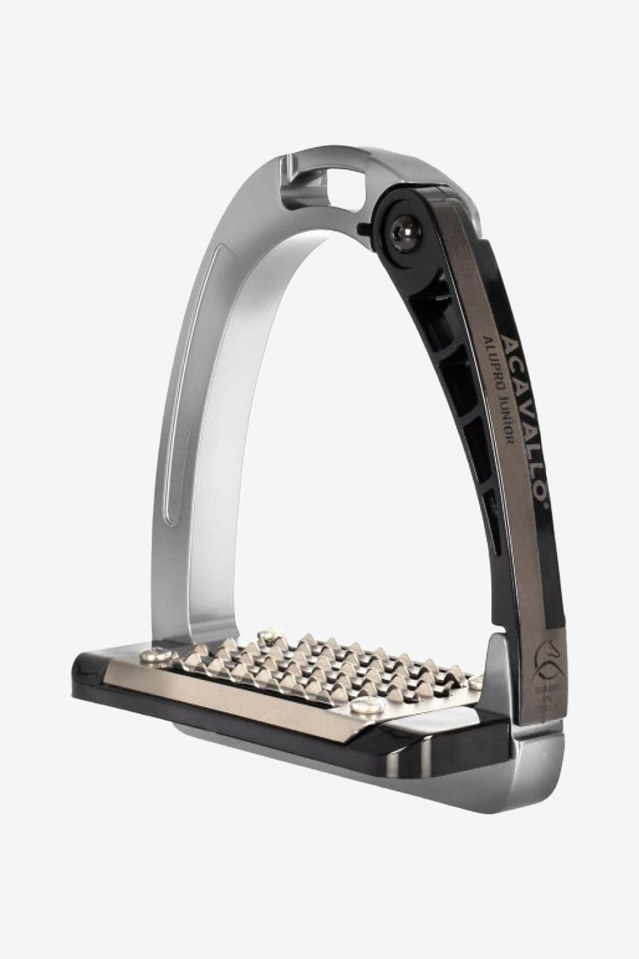 En säkerhetsstigbygel med en ytterbåge av aluminium och arm samt undre stigbygelplatta av speciellt polyamidmaterial.