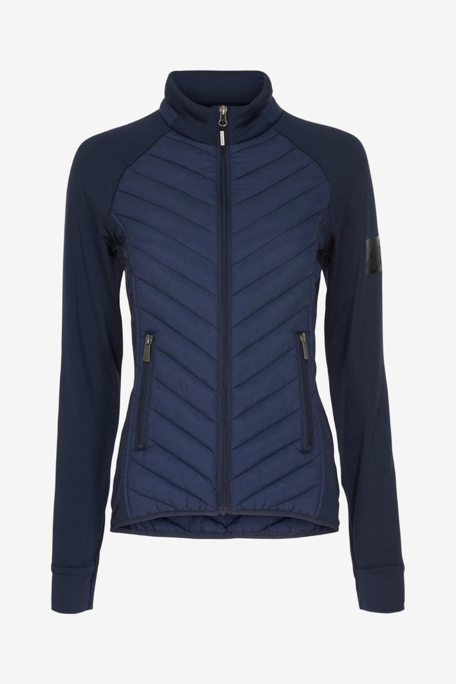Hybridjacka från Equipage i två lager som kombinerar värmande vaddering fram och bak med stretchigt funktionsmaterial i sidan samt på ärmarna. Den ergonomiska passformen gör att den lämpar sig väl för exempelvis ridning och andra utomhusaktiviteter där det krävs bra rörlighet. Jackan är utformad med en hög, skyddande krage, två praktiska sidofickor med dragkedja, tumhål i ärmsluten som håller ärmarna på plats, samt fullängds dragkedja för justerbar ventilation.