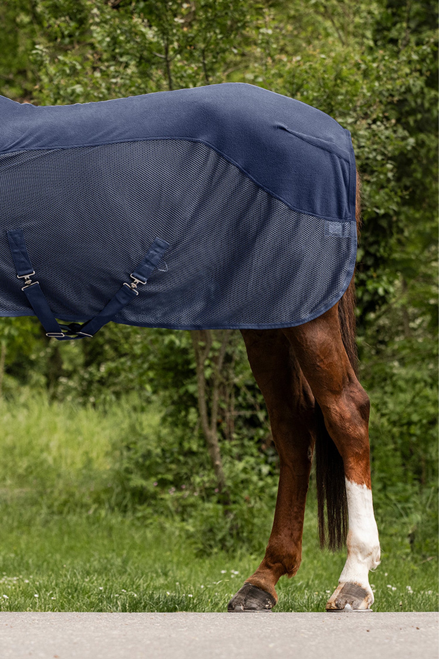 Täcket är utrustat med ett ventilerande fleecematerial över ryggen som effektivt transporterar bort fukt och förhindrar att ryggen kyls ner, vilket gör det idealiskt för användning efter ridpass eller under transport.