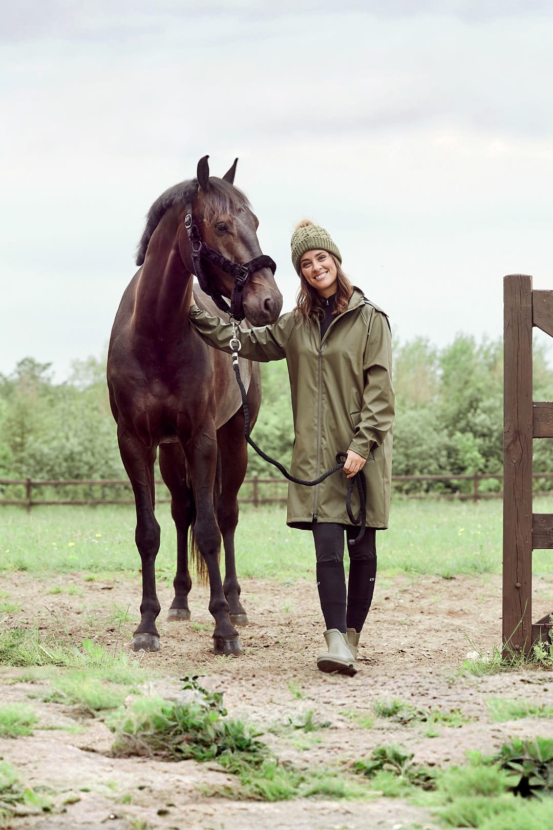 En klassisk Regnkappa från Equipage. Vattentät med sydda sömmar håller du dig torr i ur och skur. Två fickor fram med lock, samt uppknäppning baktill med tre knappar för flexibilitet vid ridning.
