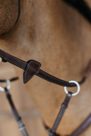 Tränset är tillverkat i högkvalitativt läder och har rostfria spännen för lång hållbarhet. Det kombinerar funktion och stil med en klassisk mörkbrun finish (Dark Havana) som ger ett elegant uttryck både på träning och tävling.