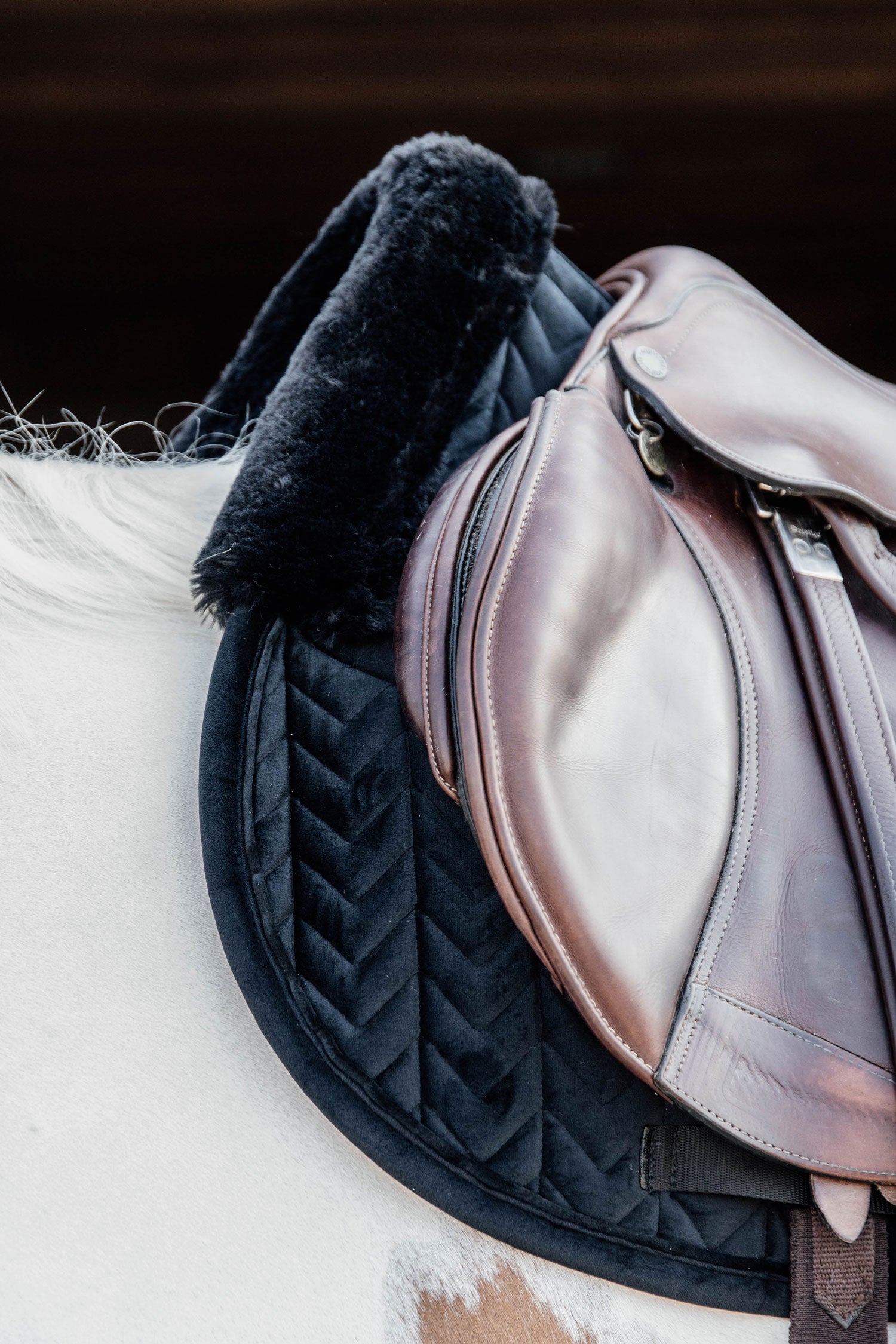 Utsidan är av mjukt sammetstyg och sytt med ett snygg fiskbensmönster. Inga remmar framtill utan endast vid sadelgjorden. Kentucky logo på vänster sida i veganskt läder. Placerad något högre upp så det finns plats för egen brodyr om så önskas.