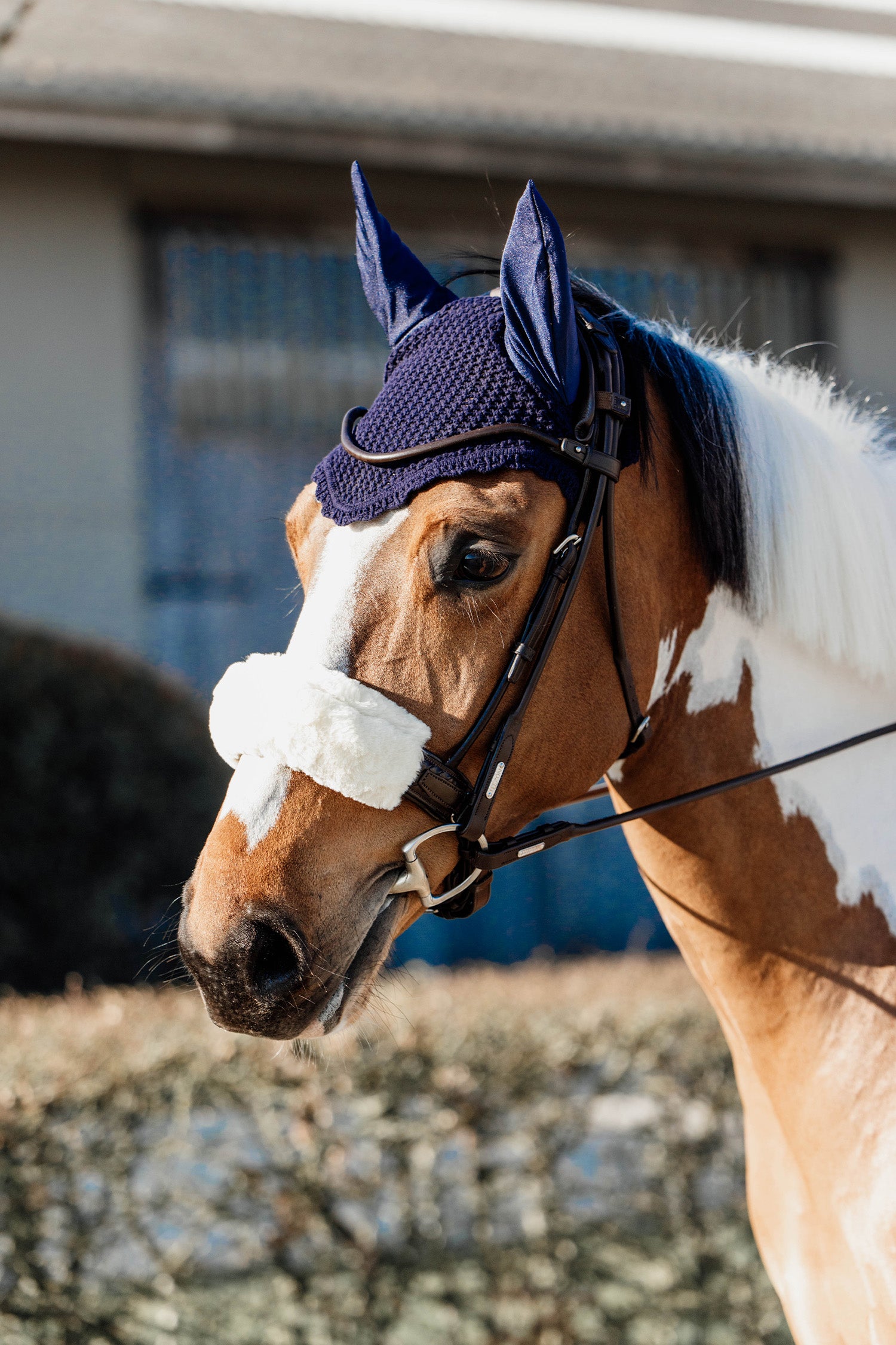 Kentucky Flughuva i navy är en klassisk och elegant huva som skyddar din häst mot insekter samtidigt som den ger ett stilrent intryck på träning och tävling. Den är handvirkad i högkvalitativt garn som gör den både slitstark och andningsbar.