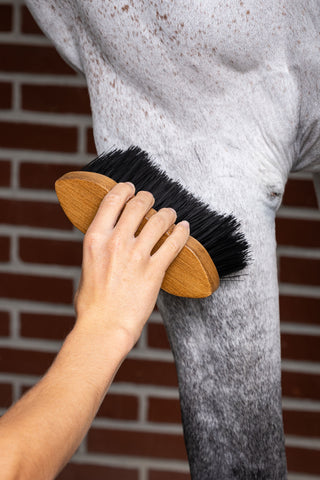 Borstens 2-i-1-funktion stimulerar huden och pälsen, medan de yttre borsten tar bort smuts och damm, vilket ger din häst en vacker glans.