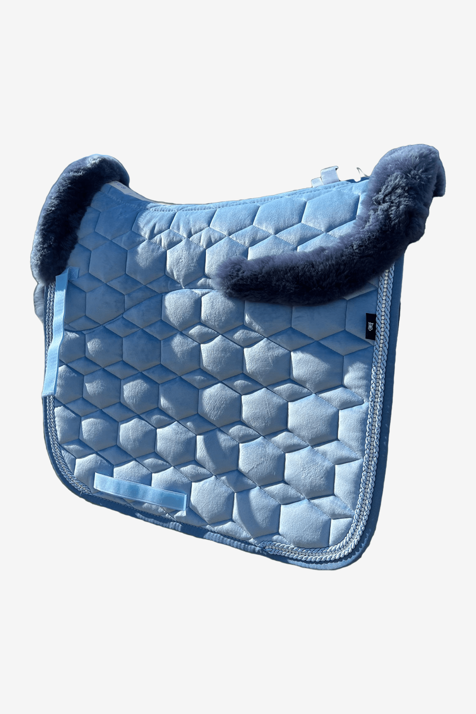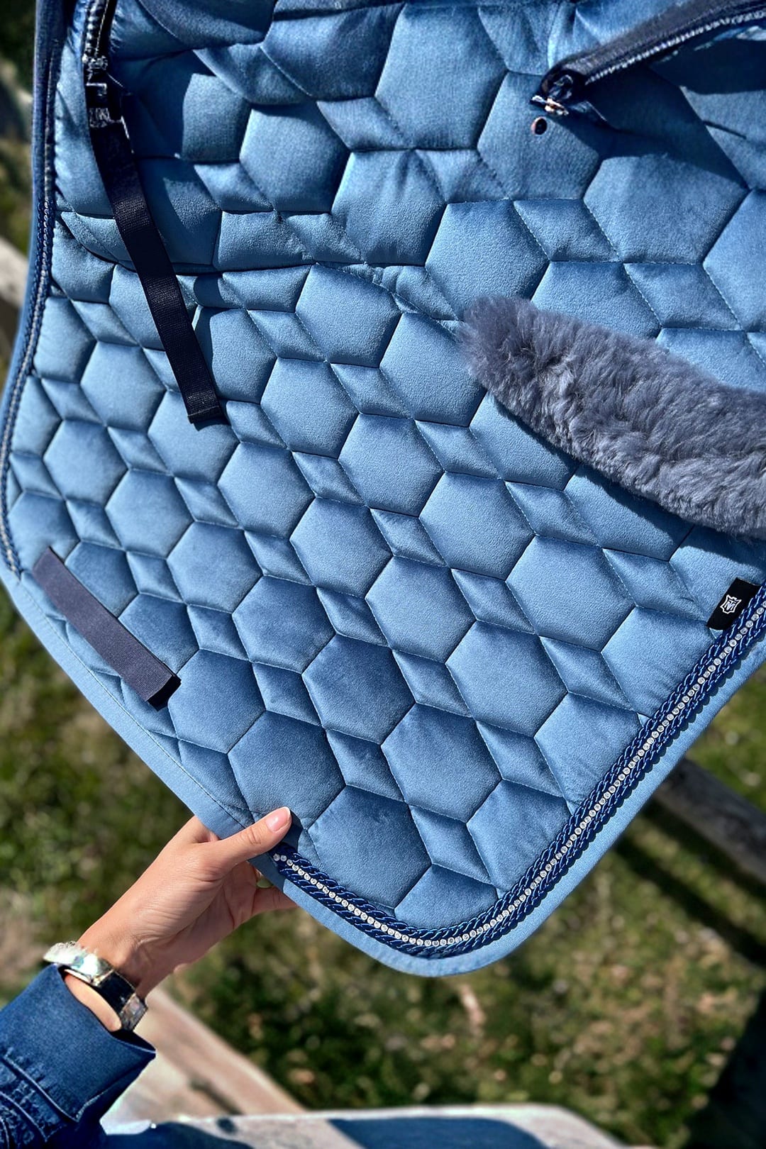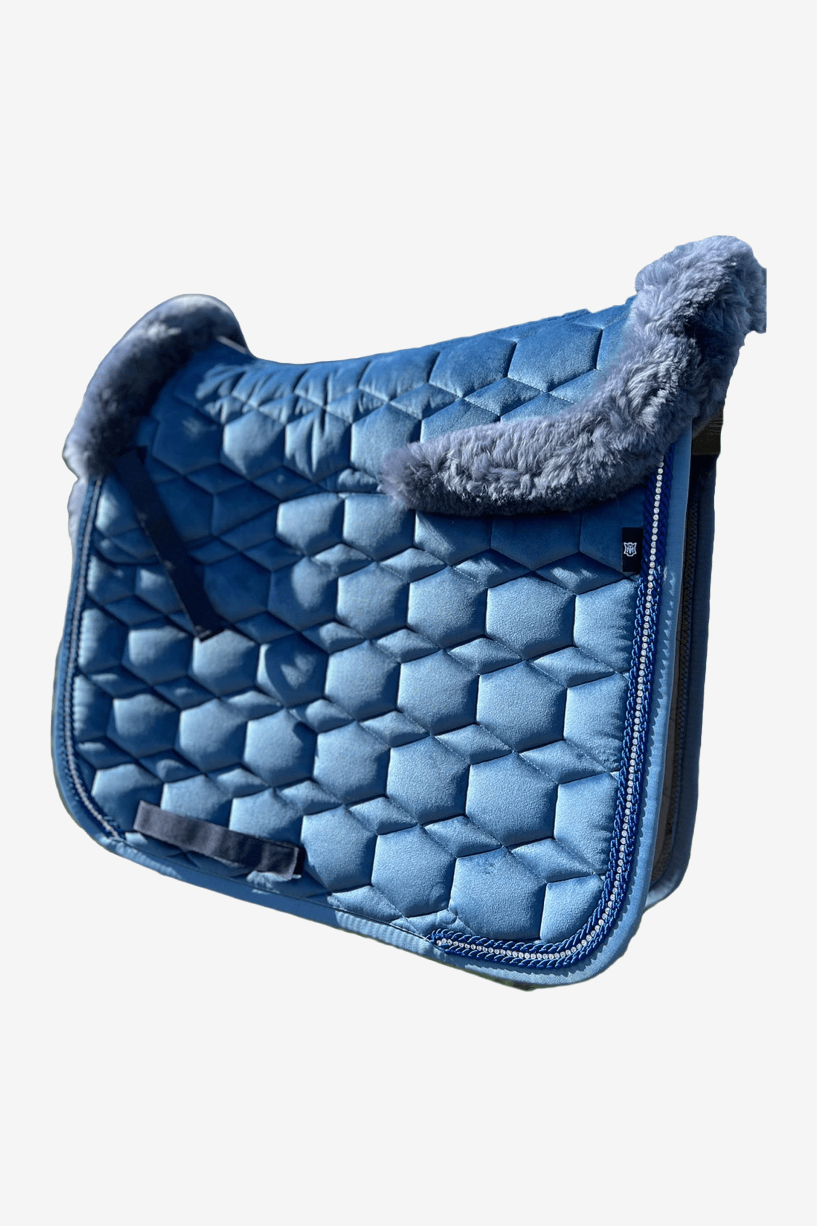Sammetsschabrak från populära Mattes med inbyggd fårskinnspad. Undersida av fårskinn som ger en stötdämpande funktion vid ridning samt utfyllnad under sadeln. Schabrak med hög andningsfunktion som transporterar bort fukt från hästen. Snyggt detaljerad med passpoal som går ton-i-ton med schabrakets färger samt fin strassrad längs med passpoalen. Tvättas enkelt i maskin på 30°.
