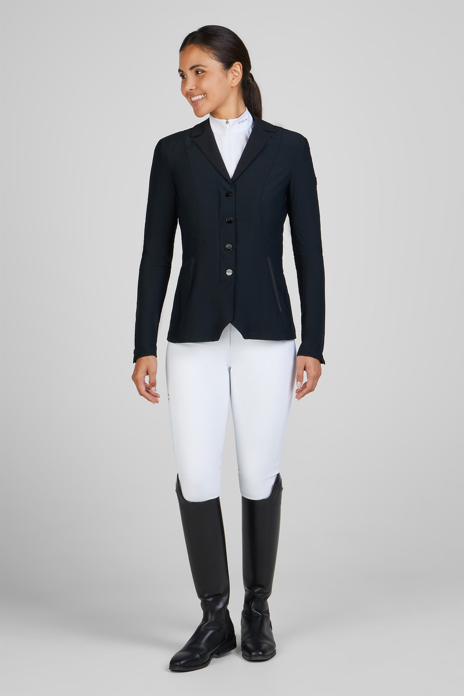 Den innovativa designen erbjuder en smickrande passform med detaljer som både ger en elegant look och håller dig sval när det behövs som mest. Kavajen har en klassisk, stilren silhuett och är utrustad med högkvalitativa dragkedjor och detaljer som ger en professionell och modern känsla. Perfekt för den seriösa ryttaren som inte vill kompromissa med vare sig stil eller funktion.