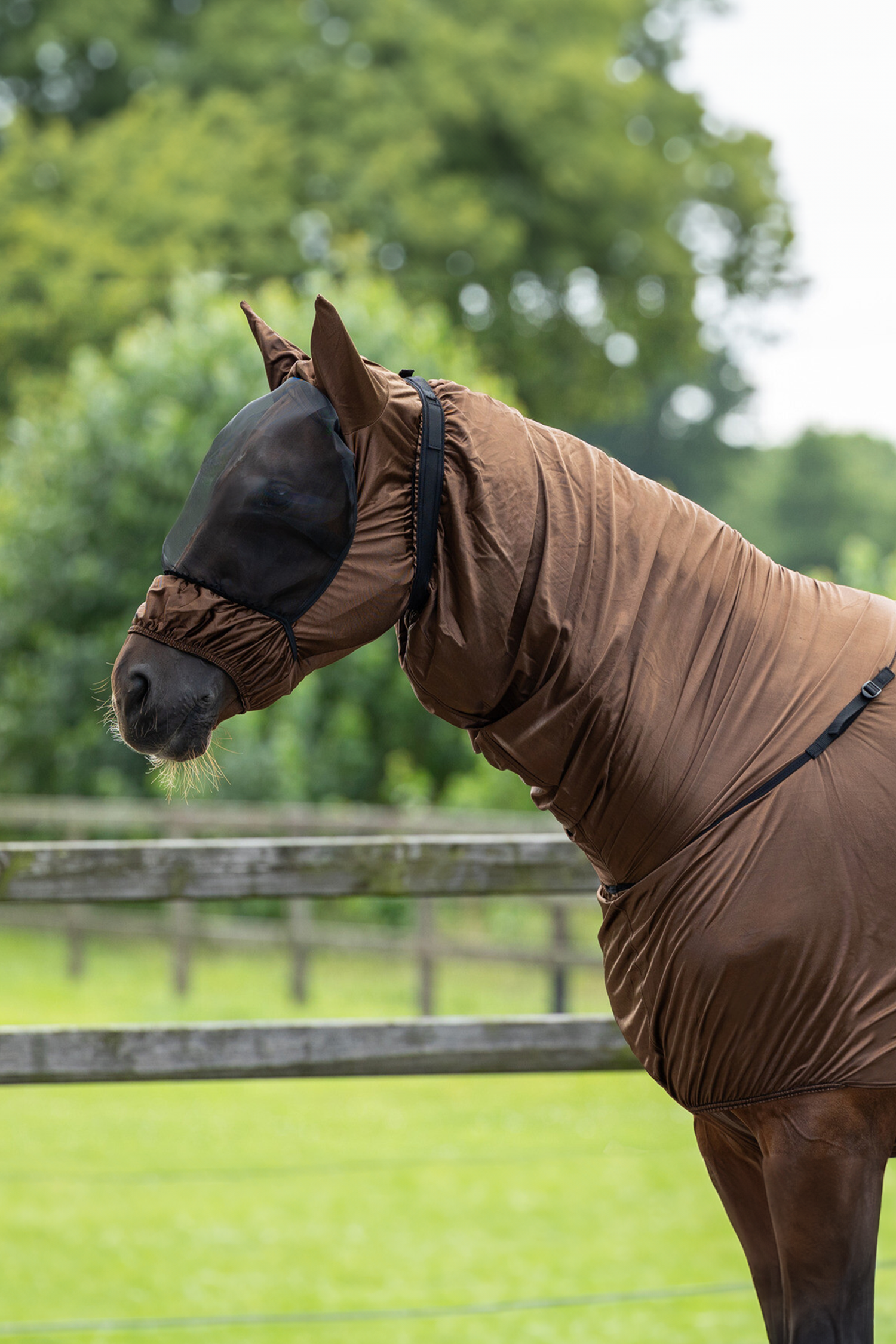 Huvan är utformad med insydda veck som ger en följsam och bekväm passform runt hästens huvud. Den kan enkelt fästas i ett matchande eksemtäcke med tre öglor och kardborreband vid halsen. Dessutom kan halsdelen fästas vid täcket med ett spänne framtill på bringan för extra stabilitet.