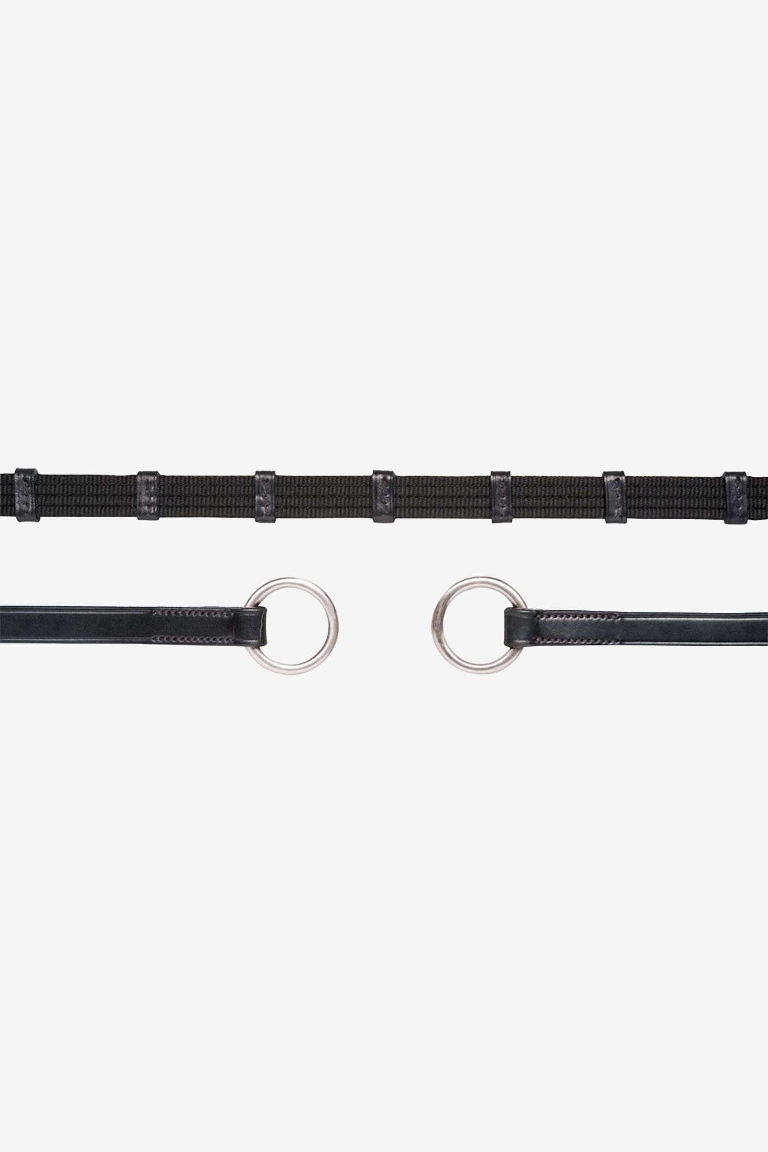 De dubbla läderstopparna på de breda vävribbstyglarna med ring säkerställer att tyglarnas längd enkelt kan ändras och underhållas av ryttaren. Den robusta ringen i änden är ett bra alternativ till den traditionella läderöglan i kombination med ett spänne.