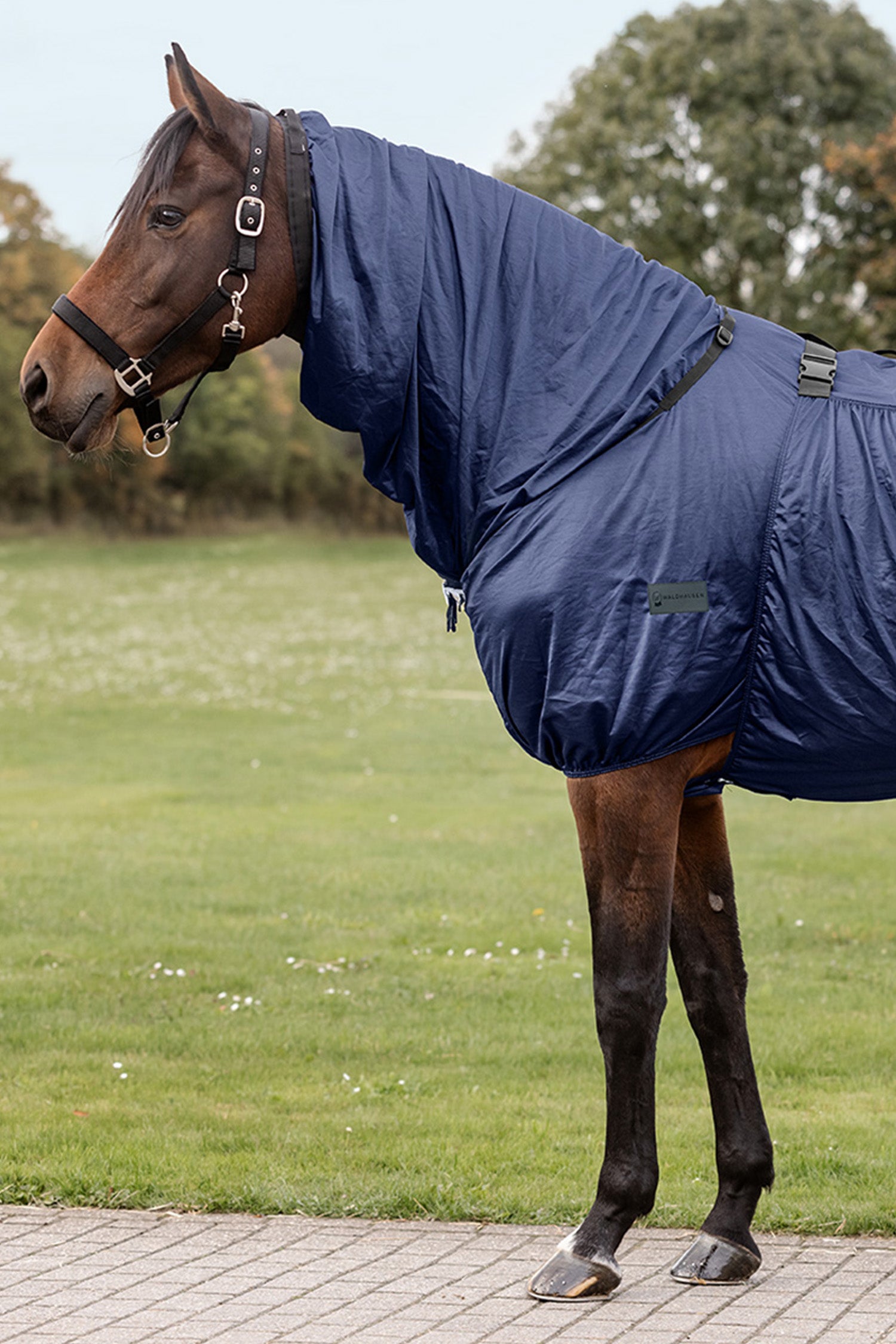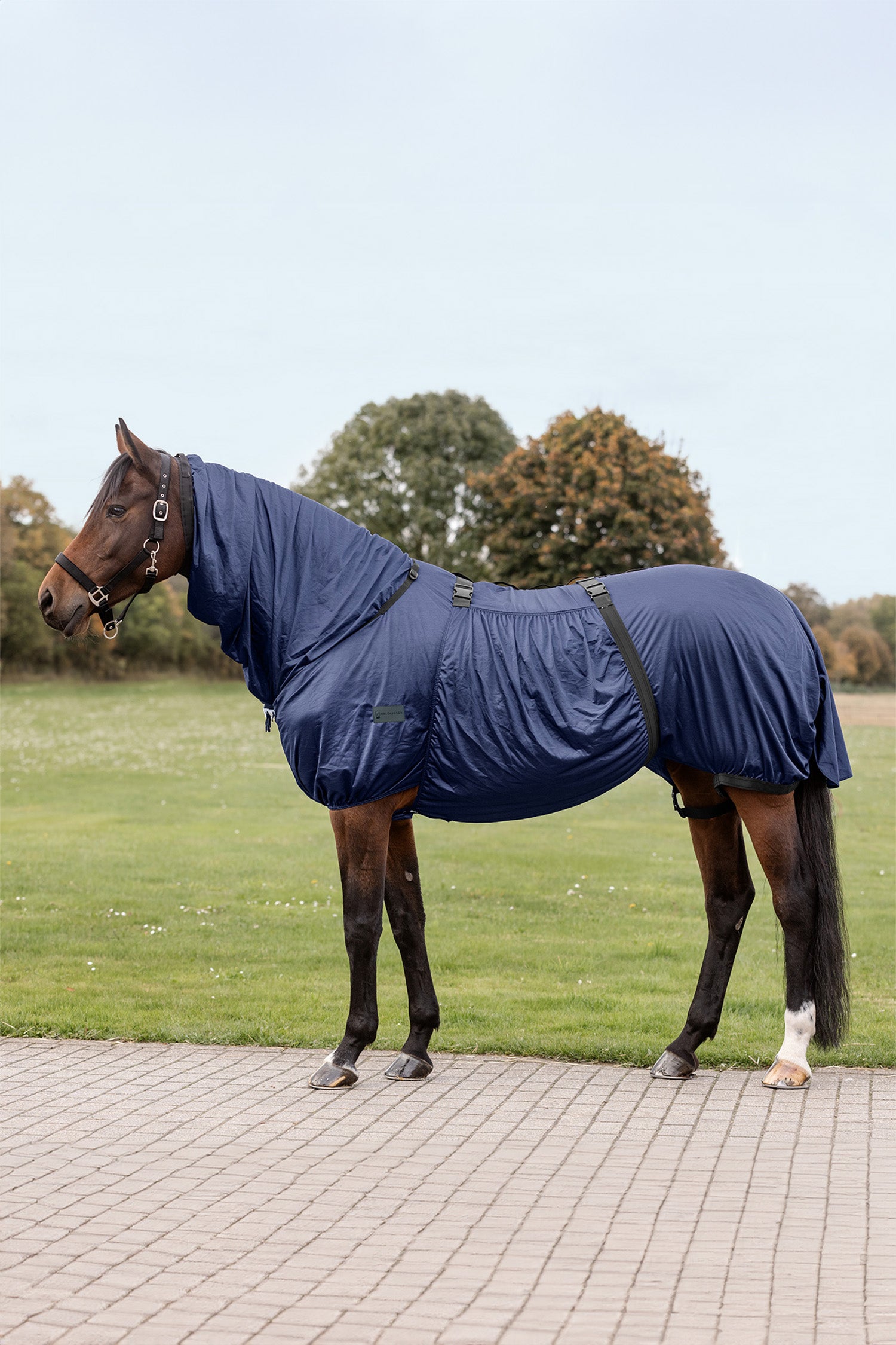 Täcket har ett fast integrerad hals samt en bred bukflik som ger extra skydd åt känsliga områden. Snoddar för benen, svanssnodd och svansskydd ser till att täcket sitter på plats även vid rörelse. Produkten levereras utan flughuva, vilket ger dig friheten att kombinera med valfri huva eller mask vid behov.